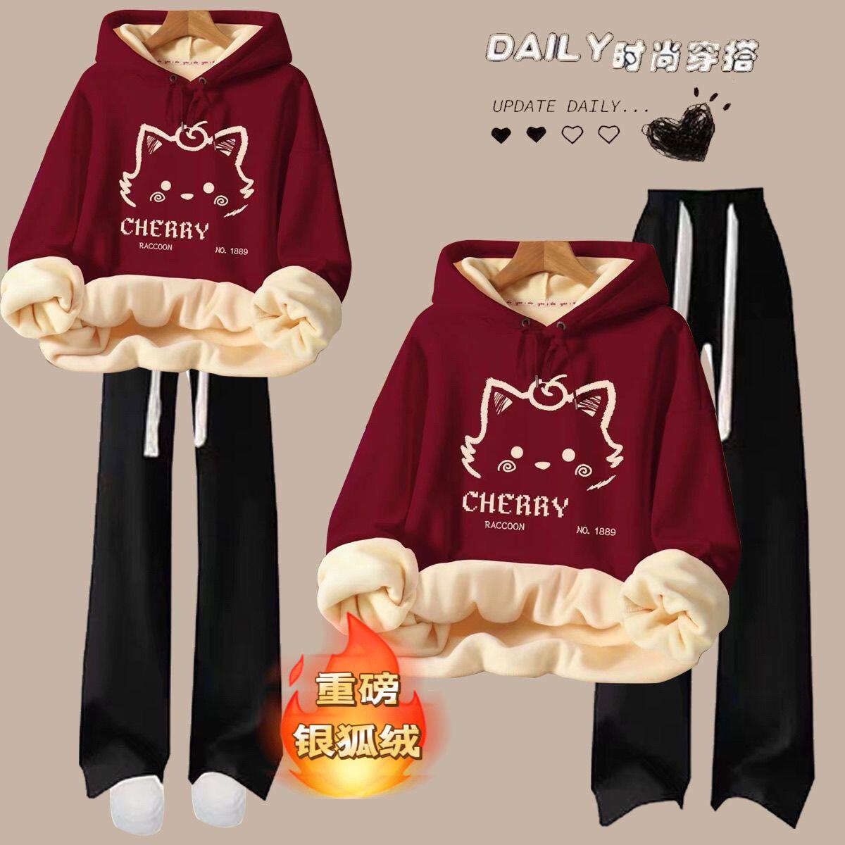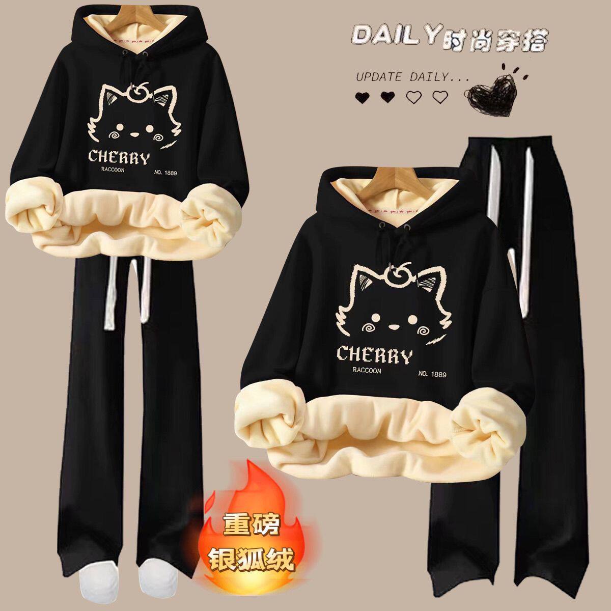 淘宝2025爆款银狐绒连帽卫衣女秋冬加绒加厚慵懒风休闲直筒裤两件套潮