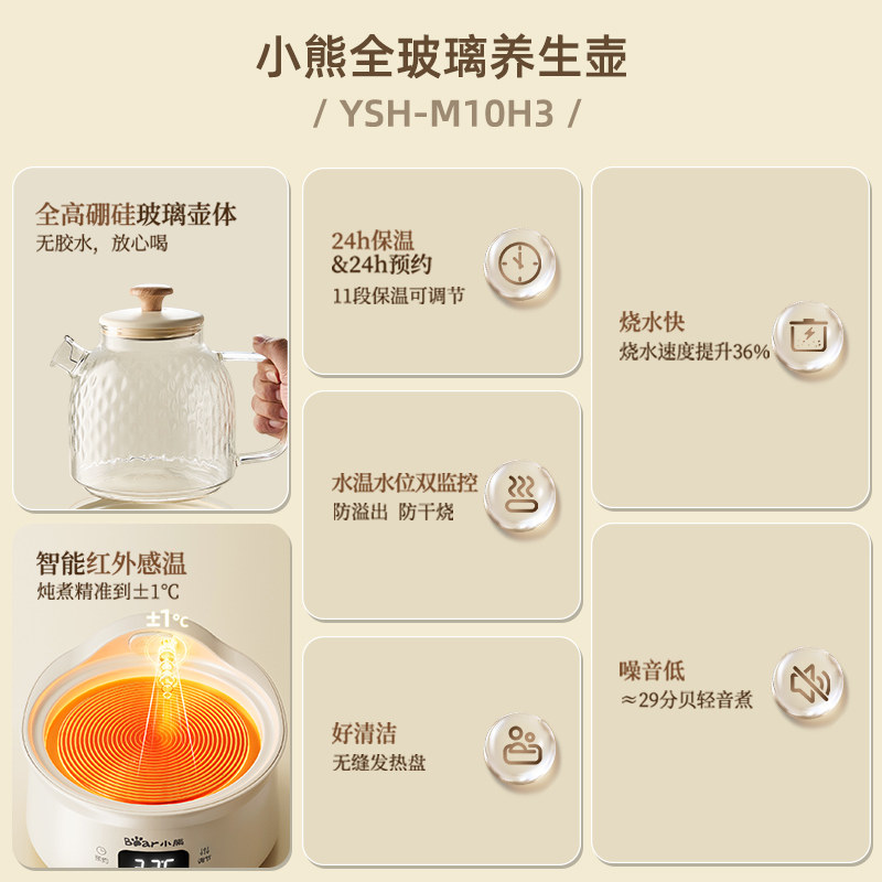小熊养生壶是一款专为现代生活设计的全玻璃家用多功能迷你煮茶器,采用高硼硅玻璃材质,耐高温、无异味,健康安全。小巧机身适合办公室、卧室或客厅使用,不占空间。支持多种功能,可煮花茶、养生汤、银耳羹、咖啡等,满足日常饮品需求。智能恒温设计,精准控温,避免反复烧煮破坏营养。一键操作简便易用,搭配滤网设计,茶渣分离更贴心。静音加热,办公环境不扰人。新款升级外观简约时尚,既是实用小家电,也是桌面装饰亮点。小熊养生壶,让健康饮水与精致生活触手可及。