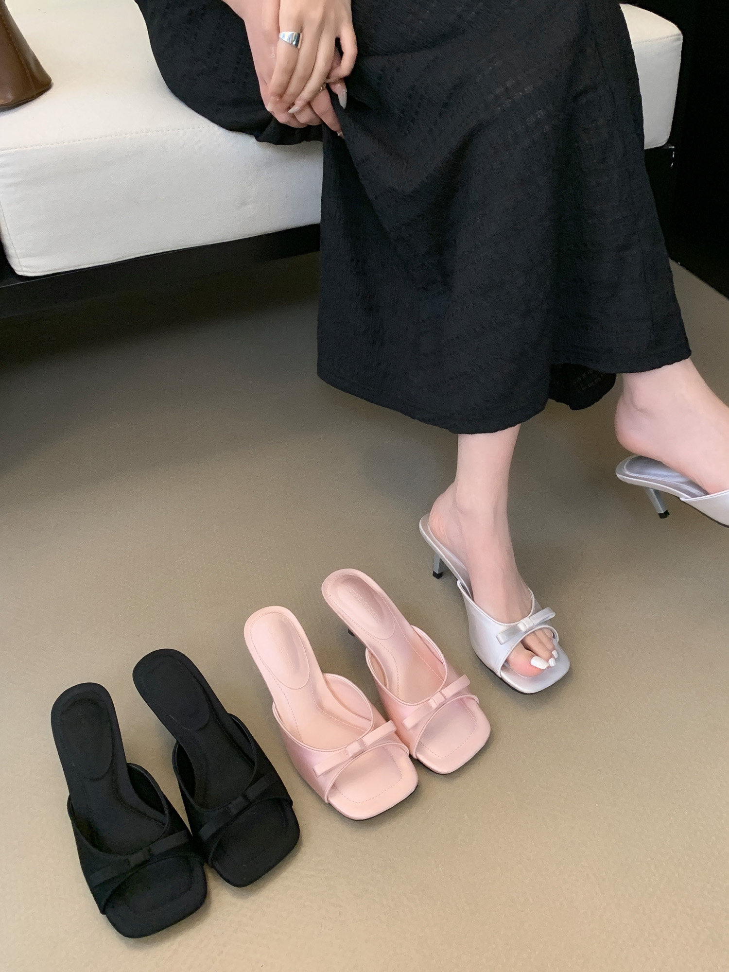 淘宝法式气质纯色蝴蝶结方头露趾细跟凉拖鞋2024夏季仙女风外穿高跟鞋