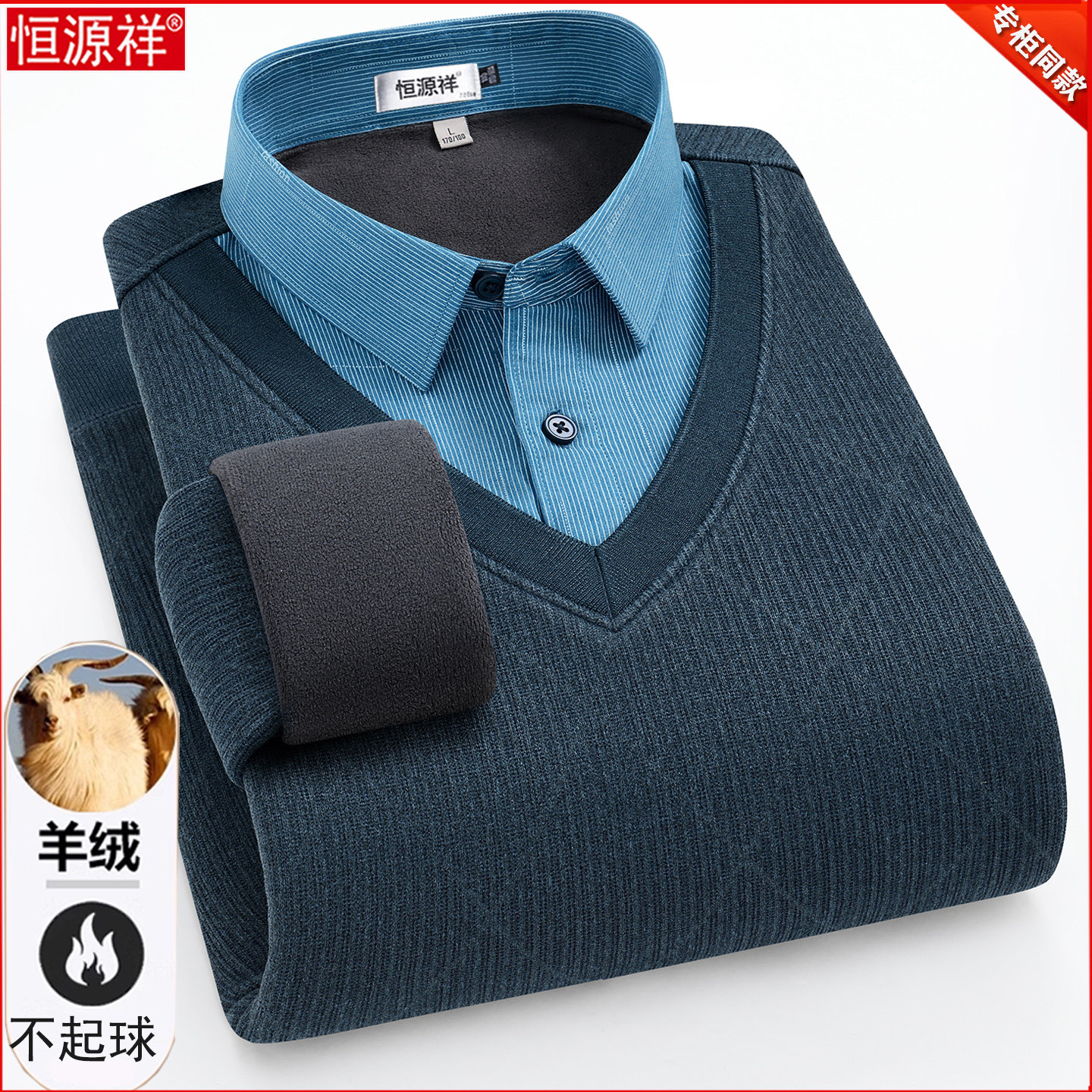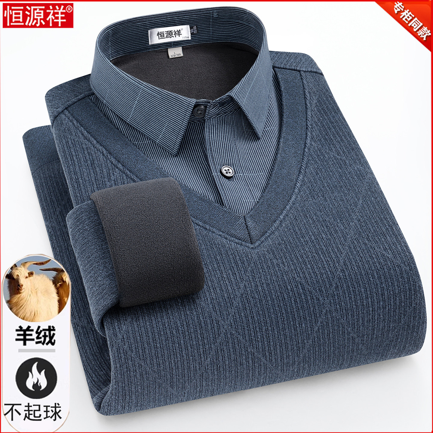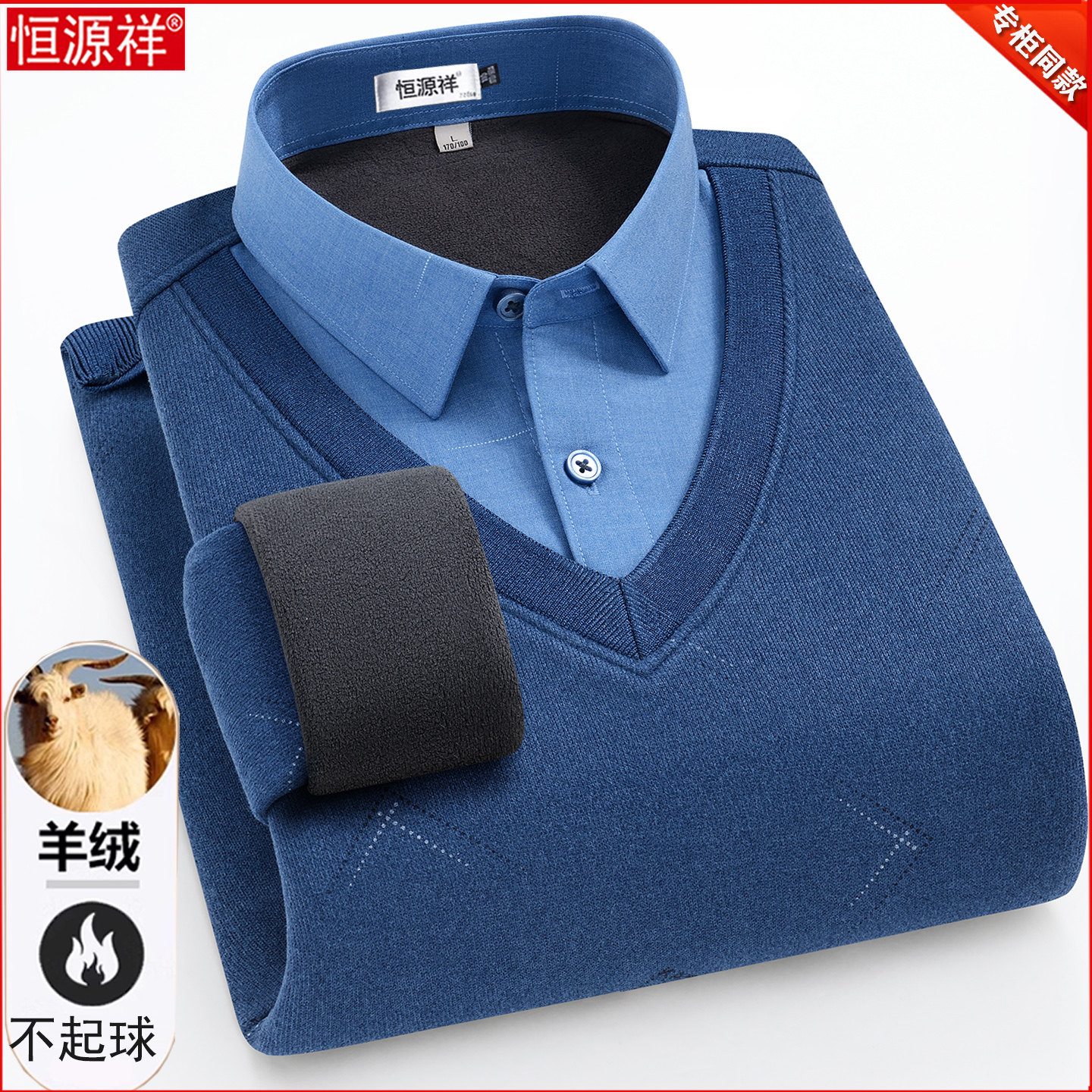 淘宝恒源祥羊绒衫男中年时尚假两件羊毛衬衫领加绒加厚保暖爸爸装毛衣