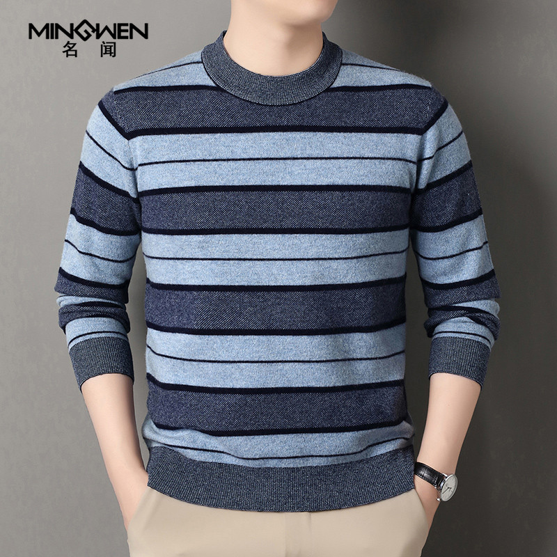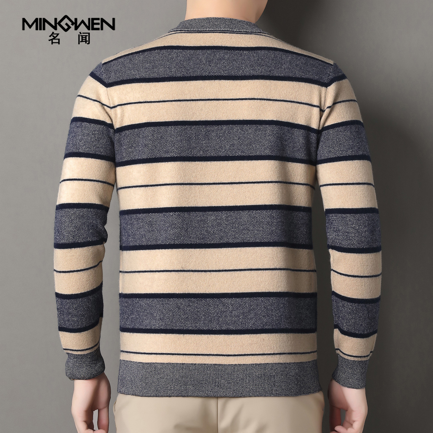 天猫圆领毛衣男装薄款时尚高级感条纹拼色休闲打底针织含山羊绒羊毛衫