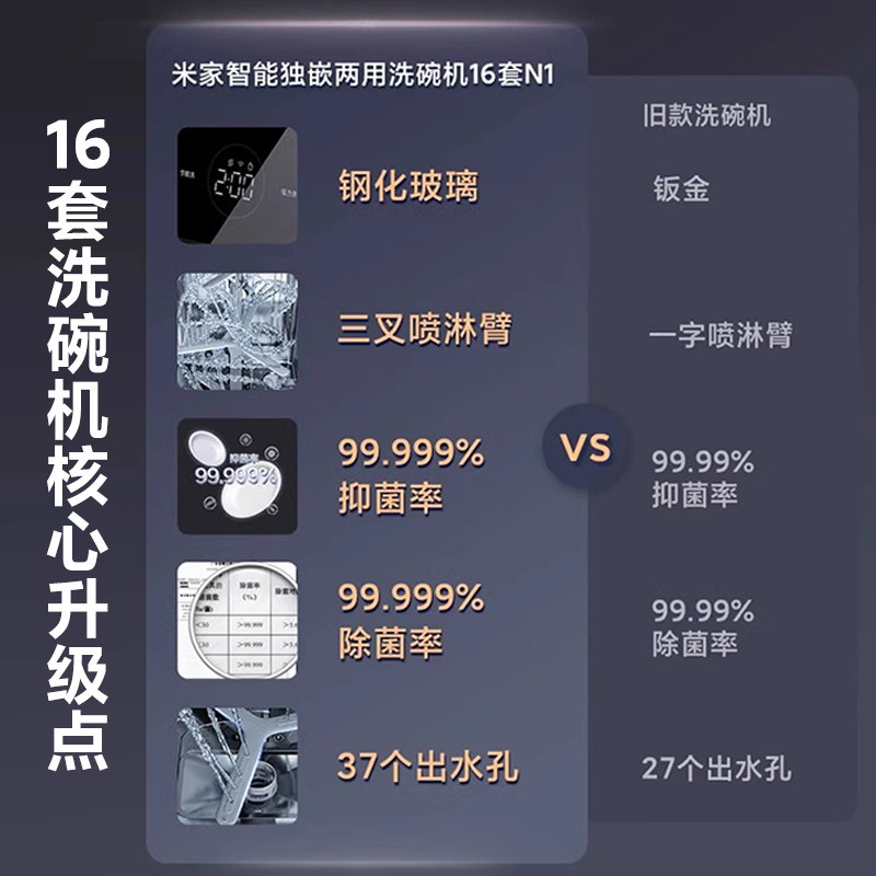 小米米家洗碗机16套N1是一款集独立、台式、嵌入式多种安装方式于一体的大容量家用洗碗机,适合多口之家使用。拥有16套超大容量,可轻松容纳锅碗瓢盆,满足日常及聚餐清洗需求。搭载热风烘干技术,洗涤后快速循环热风,实现餐具干爽无残留,有效防止细菌滋生。内置高温除菌功能,配合强力喷淋系统,深层清洁油污,达到消毒级洁净效果。智能操控简洁直观,支持多种洗涤模式,节能省水。机身设计简约大方,适配现代厨房风格,是提升生活品质的实用家电之选。