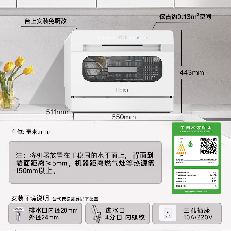 天猫海尔小海贝白台式洗碗机8套免安装小型家用独立UV消毒除菌旗舰