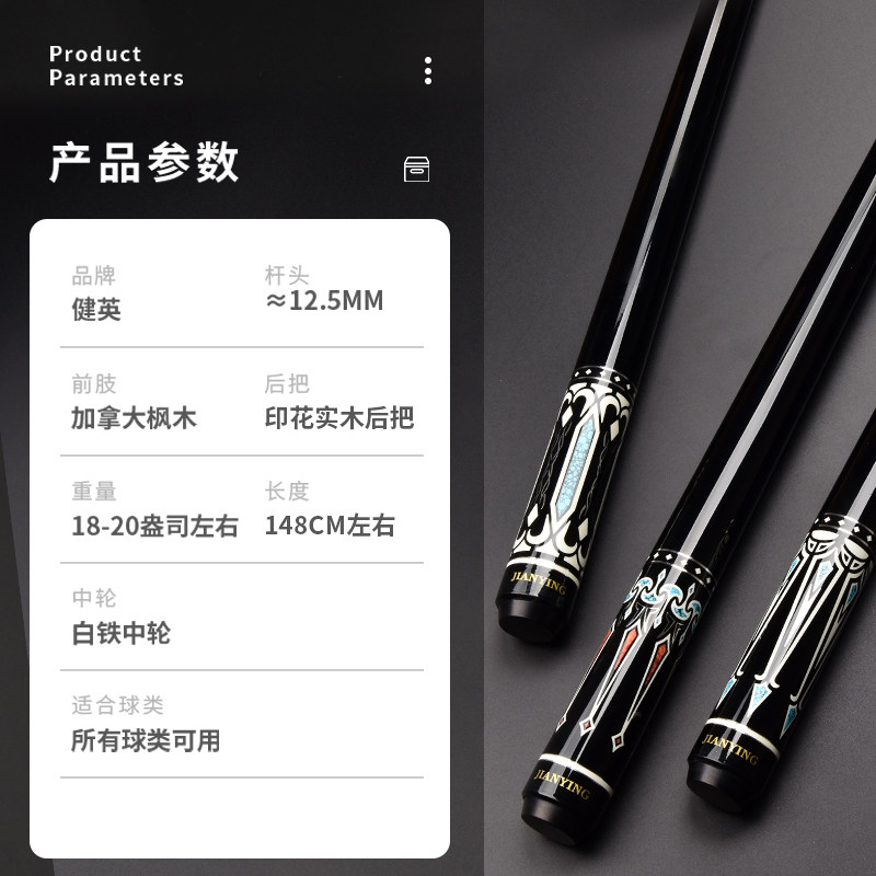 天健英JIANYING台球用品配件斯诺克台球杆黑8八小头桌球杆加长后把