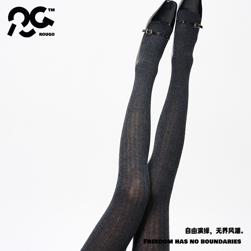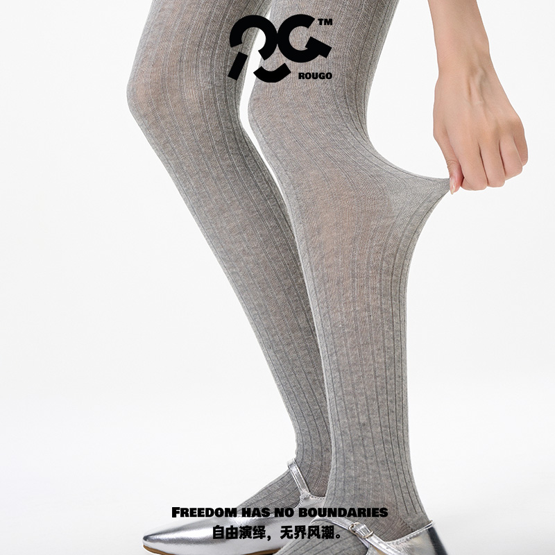 淘宝Rougo灰色miu系坑条棉直角跟连裤袜竖条纹丝袜女春秋款打底裤袜