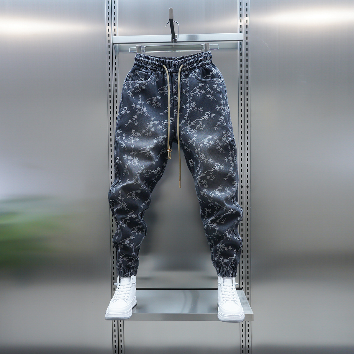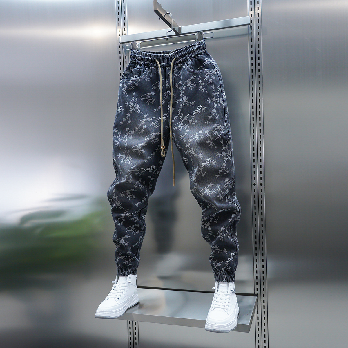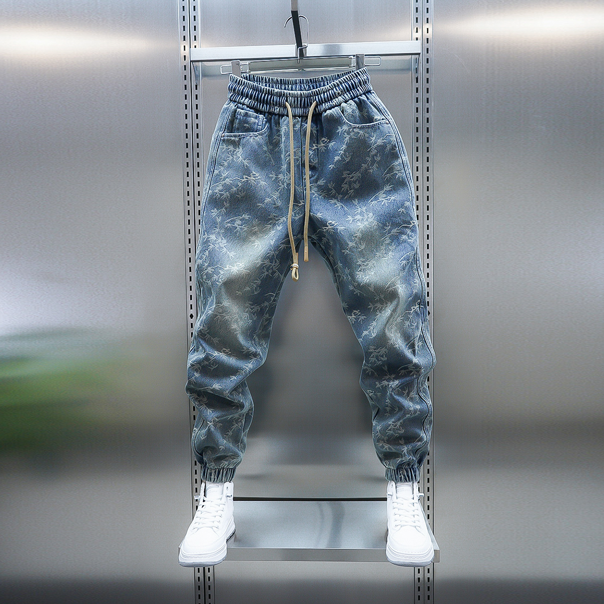 淘宝潮流男士春秋新款牛仔裤浅蓝色重工提花束脚裤加厚松紧腰小脚裤