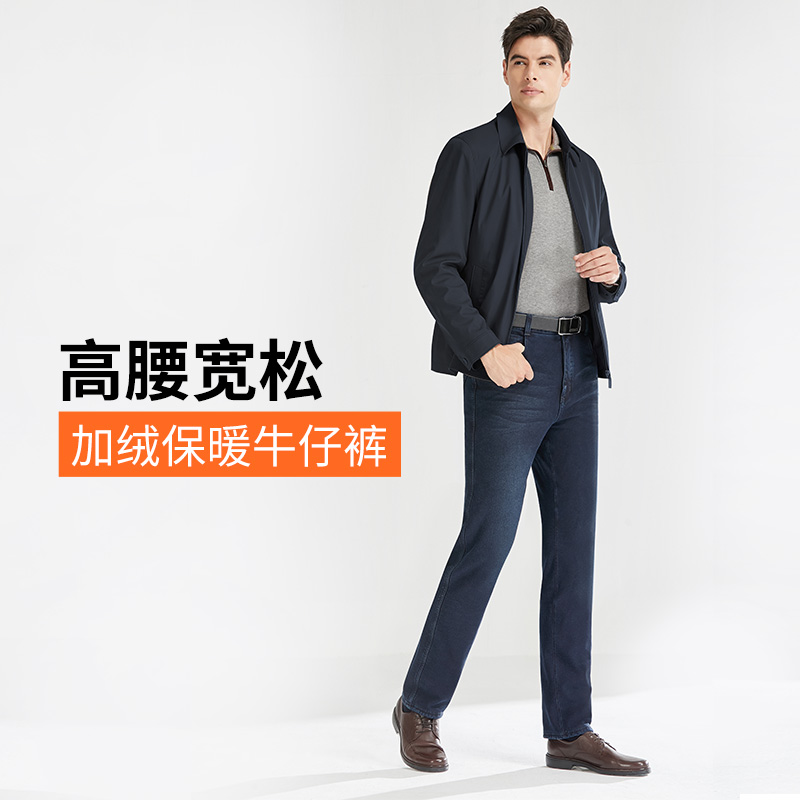 罗蒙牛仔裤男秋冬新款宽松直筒商务休闲中老年高腰加绒加厚长裤子