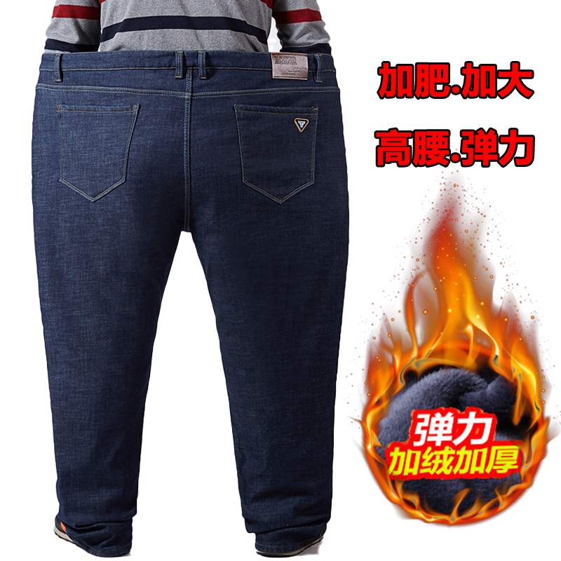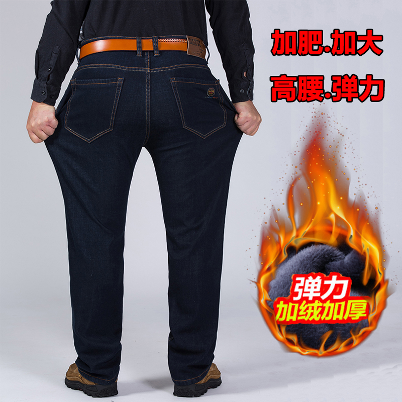 淘宝秋冬款加肥加大爸爸高弹力宽松直筒牛仔裤男胖子保暖加绒加厚棉裤
