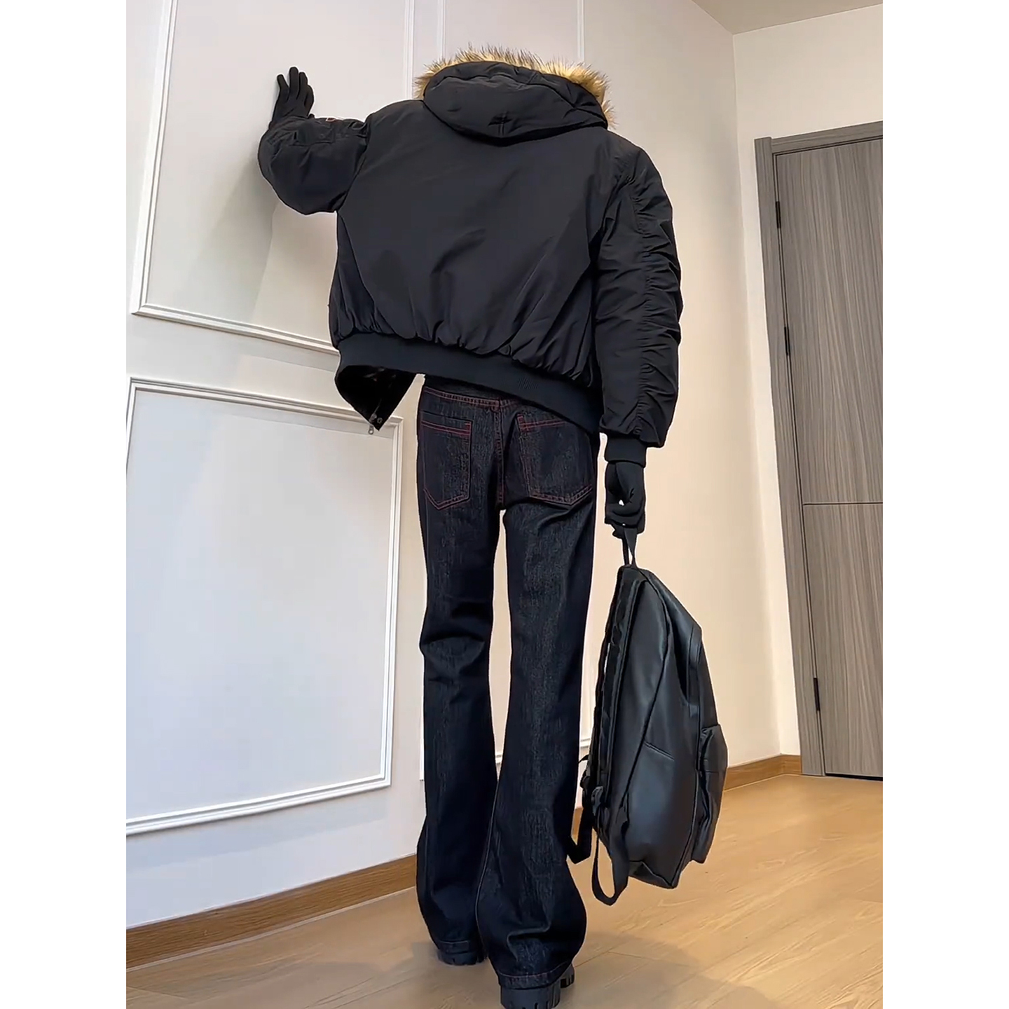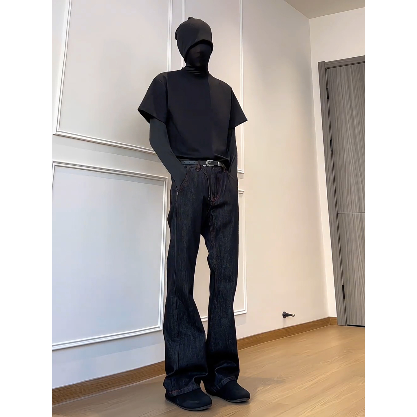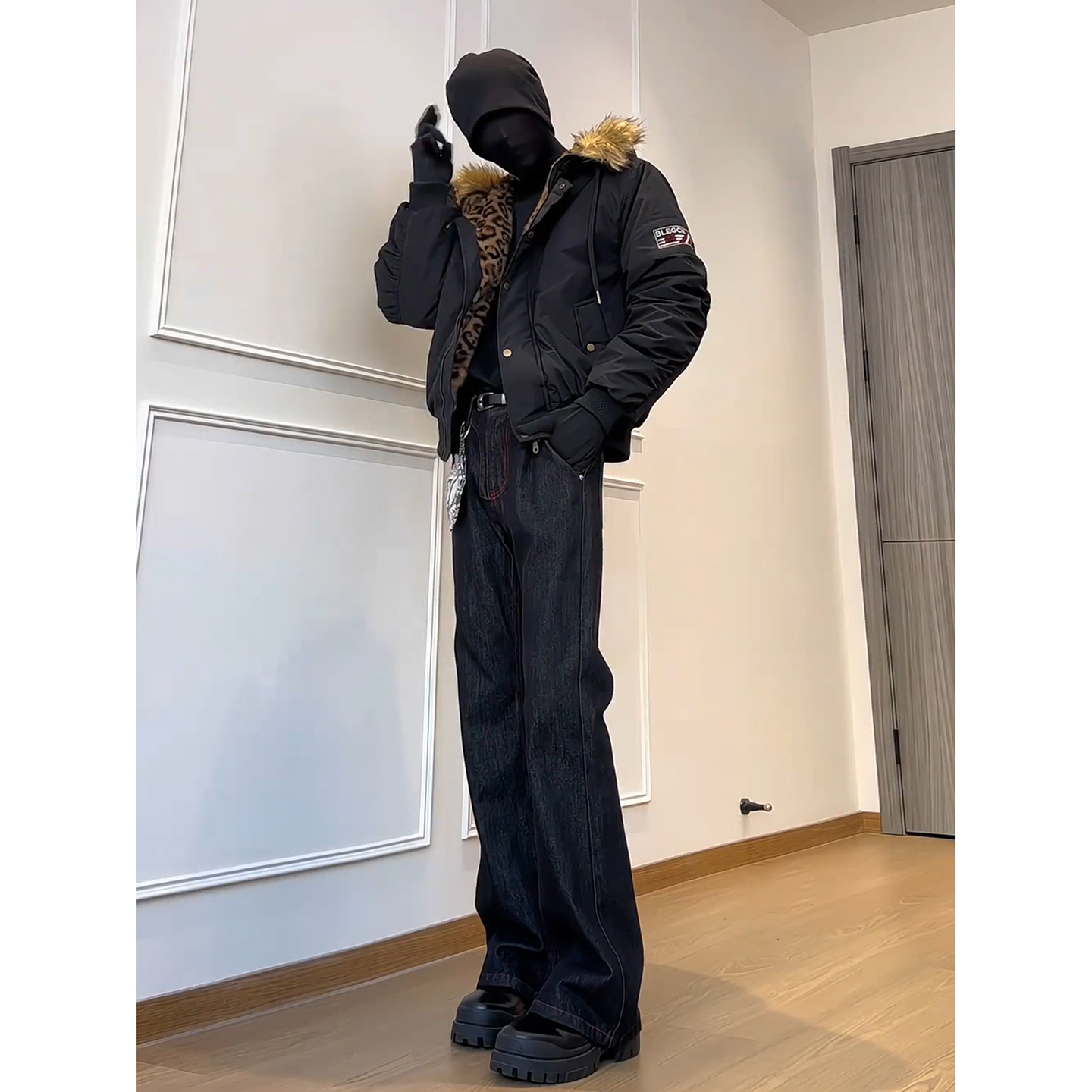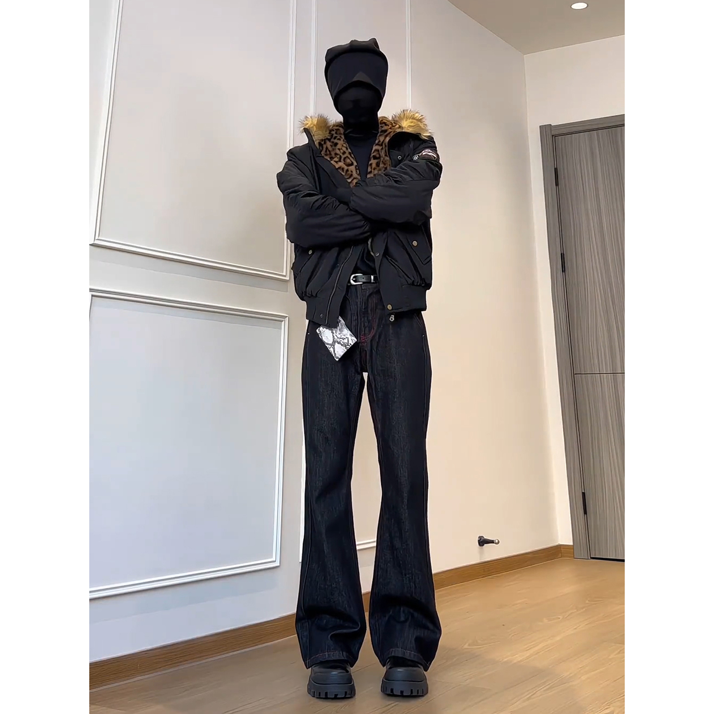 天黑色弯刀牛仔裤男秋冬季加绒保暖直筒裤子美式高街微喇男生长裤