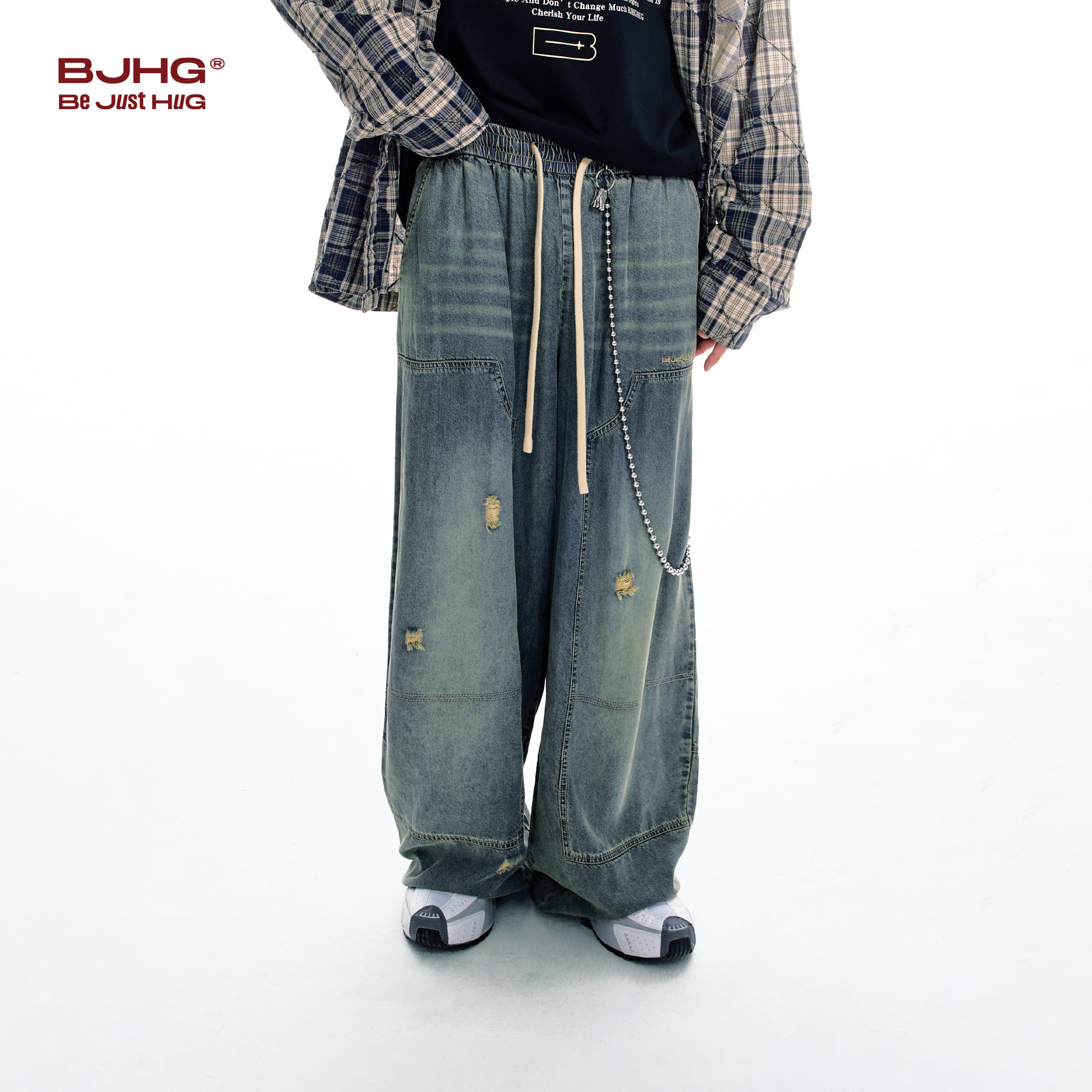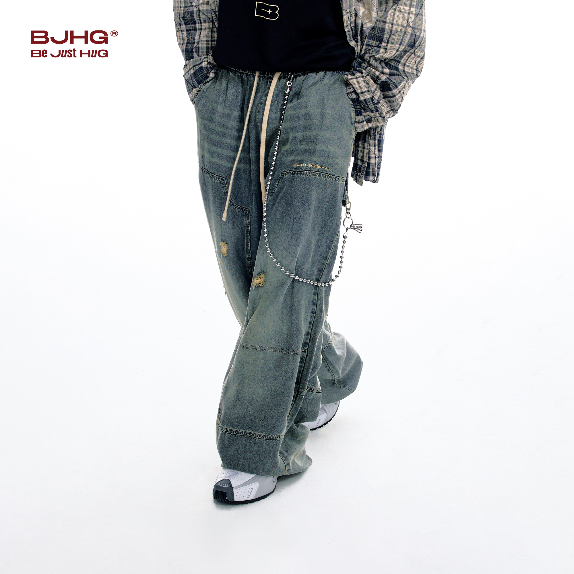 bdpowerup重磅休闲牛仔裤男秋季美式做旧长裤子宽松肌理感弯刀裤