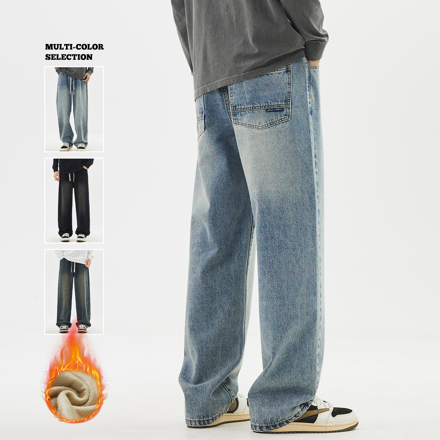 wassup happy美式高街牛仔裤男春秋冬季新款加绒宽松直筒休闲裤子