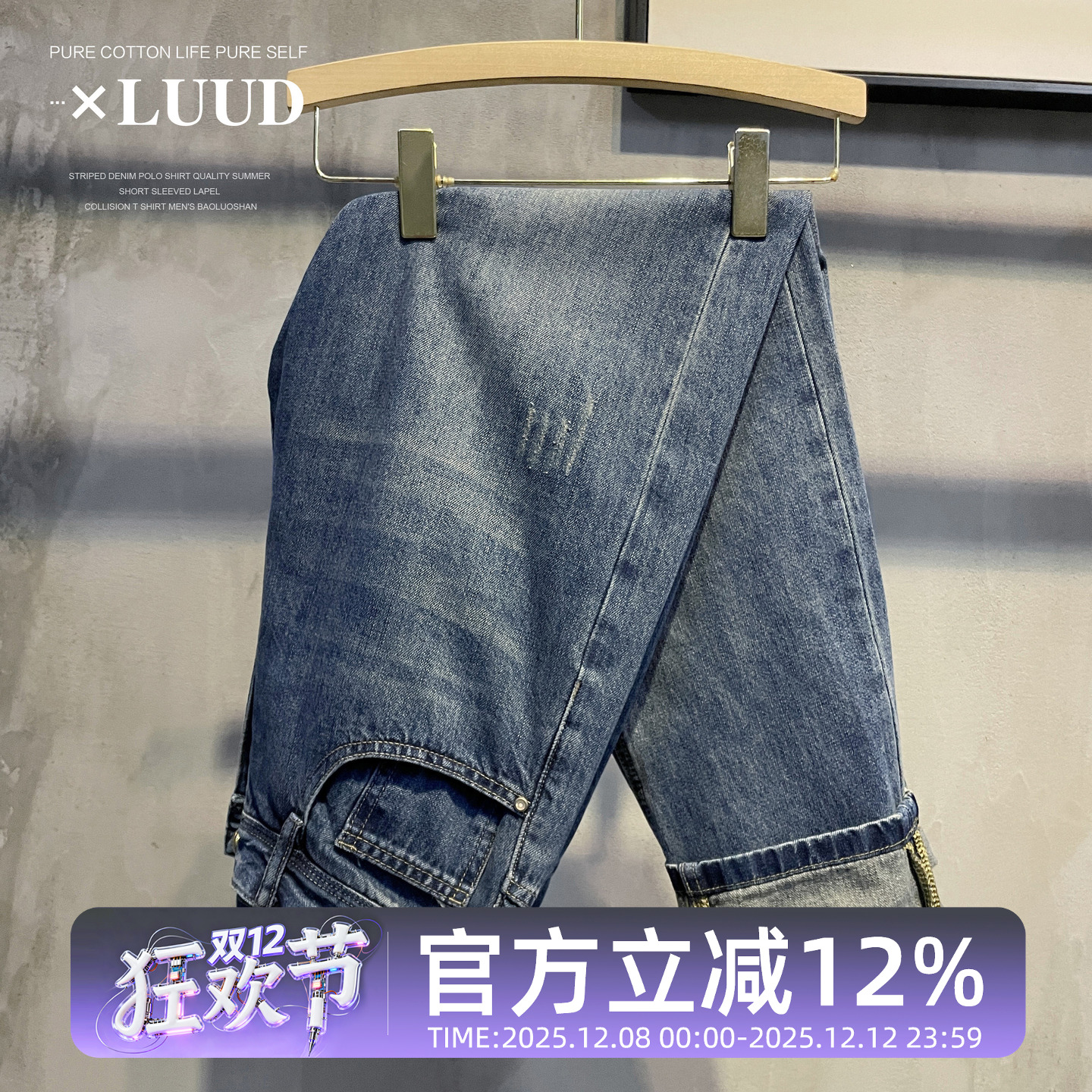 淘宝LUUD 新款简约复古小直筒长裤韩版个性猫抓破男士怀旧休闲牛仔裤