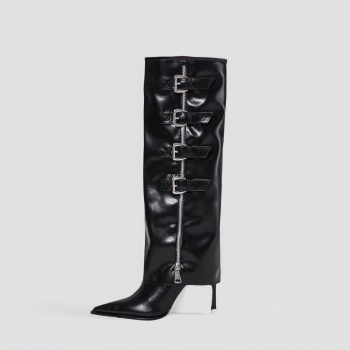 淘宝早秋尖头多扣细跟长筒靴显瘦小众设计时装百搭辣妹走秀高跟裤管靴