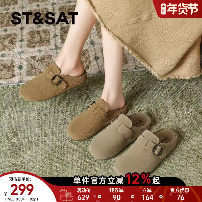 天猫星期六真皮加绒勃肯鞋半拖女鞋2025秋冬新厚底休闲百搭懒人一脚蹬
