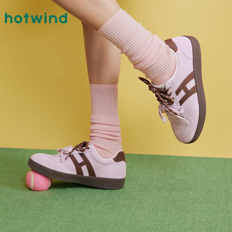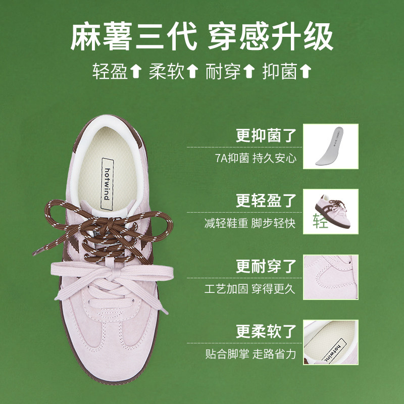 2026年春季新款热风麻薯德训鞋女鞋H14W26112,以轻盈舒适为核心设计理念,融合经典德训鞋型与现代休闲美学。鞋面采用透气麻薯质感面料,柔软亲肤,贴合脚型,搭配复古撞色滚边设计,时尚百搭。中底搭载缓震科技,提供全天候舒适脚感,适合日常通勤、慢跑及休闲出行。平底设计稳定贴合,久走不累。轻盈鞋身搭配防滑耐磨橡胶大底,抓地力强,适应多种地面。无论是搭配牛仔裤、裙装或运动风造型,都能轻松驾驭,是春日衣橱的必备单品,兼顾颜值与实穿性,诠释自在随性的都市生活态度。