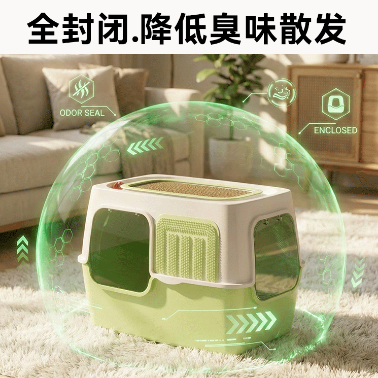 这款超大号全封闭猫砂盆专为缅因等大型幼猫设计,空间宽敞,猫咪转身、刨砂更自在。采用高围挡防外溅设计,有效减少猫砂带出,保持地面整洁。全封闭结构搭配活性炭过滤层,强力吸附异味,持久锁臭,室内空气更清新。顶部掀盖式开口,方便清理和换砂,同时兼顾私密性,让猫咪如厕更安心。材质环保耐用,底部防滑设计稳固安全。整体结构可拆卸,清洗便捷,便携提手设计让移动更轻松。无论是居家使用还是出行携带,都是理想选择,为爱宠打造舒适洁净的如厕环境。