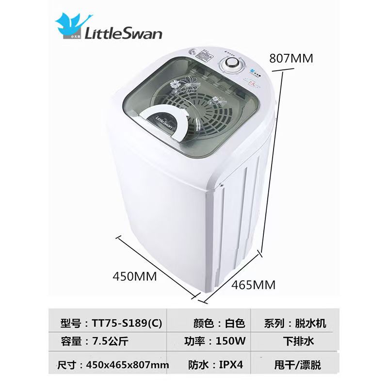 商品介绍:小天鹅脱水机单脱机甩干机家用型TT75-S189(C),拥有7.5公斤KG大容量,适合家庭使用。它采用脱水桶设计,具备高效脱水、快速甩干的特点,让您轻松解决衣物潮湿问题。该脱水机体积小巧,不占空间,适合各种家居环境。操作简单,安全可靠,是家庭洗衣的好帮手。无论是清洗大件衣物还是小件物品,都能满足您的需求。高效脱水性能,让您的衣物更加干净清爽。购买这款小天鹅脱水机,让您的生活更加便捷舒适。