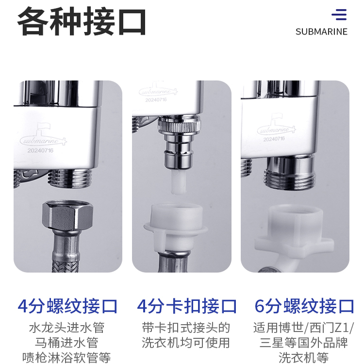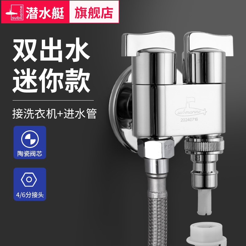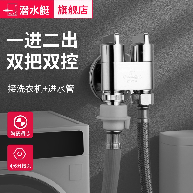 天猫潜水艇全铜角阀一进二出双控水阀一分二双出水洗衣机水龙头分水器
