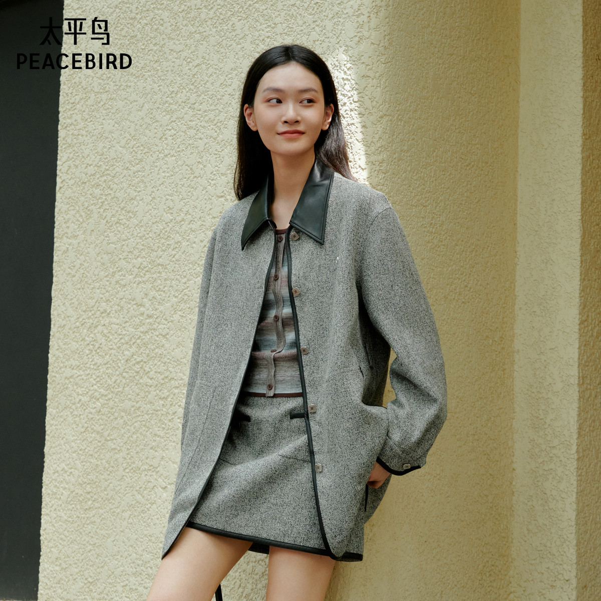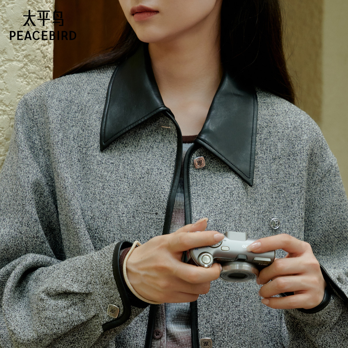天猫太平鸟女装冬季款花灰PU包边大衣A1AAE4191