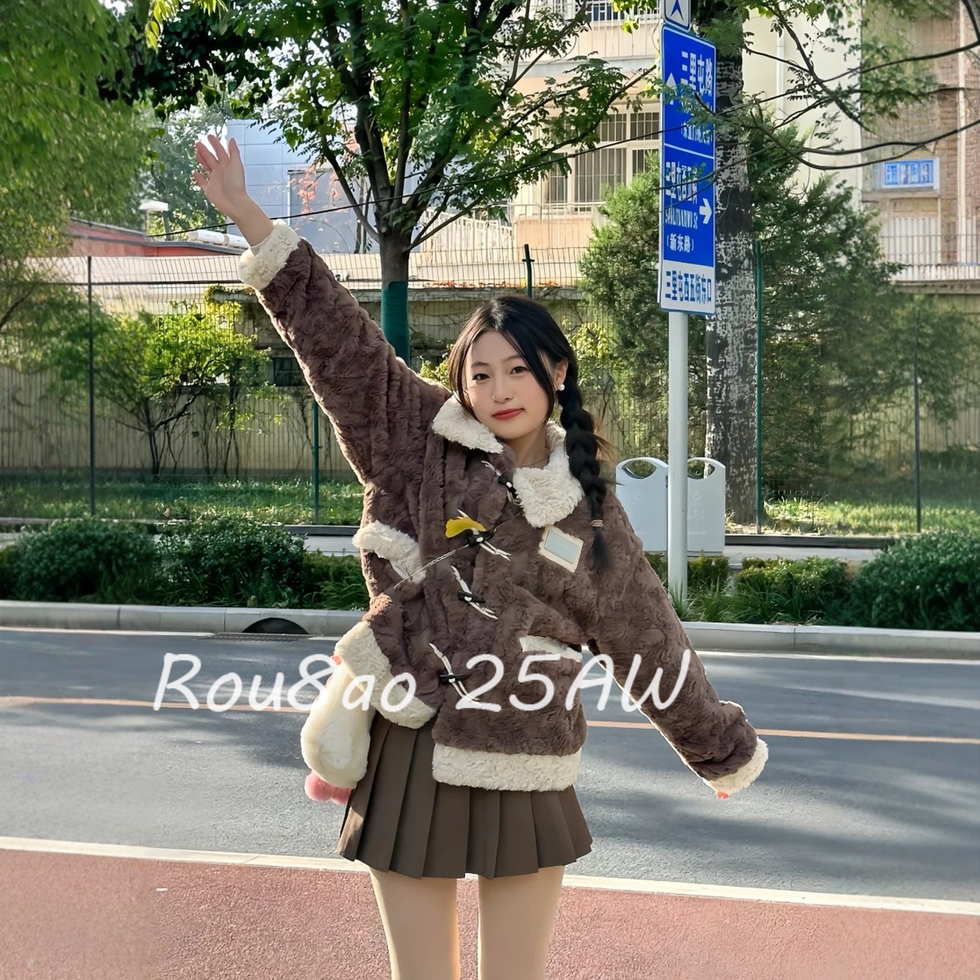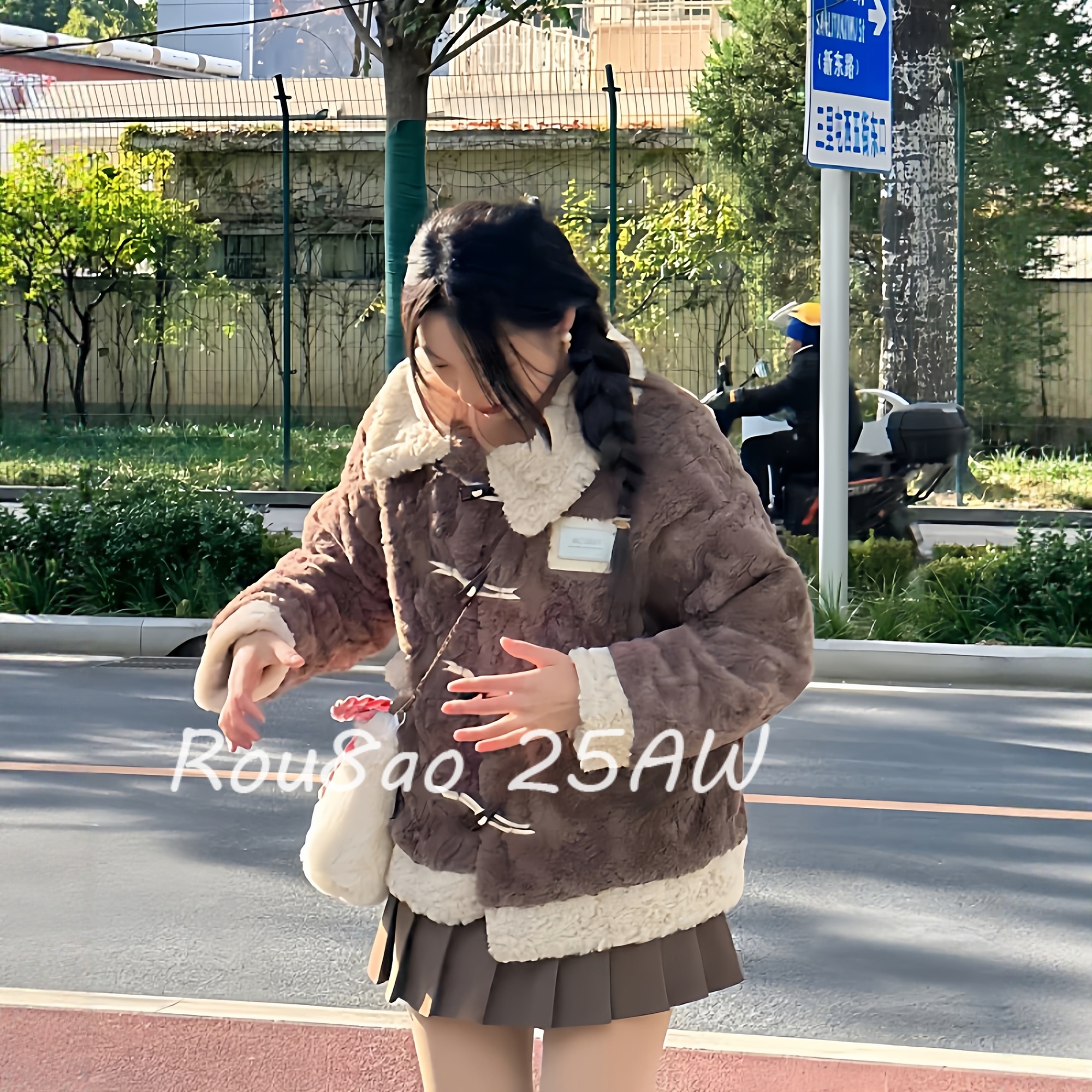 淘宝Rou8ao微胖大码女装牛角扣设计外套女冬季宽松加厚毛绒绒棉服大衣