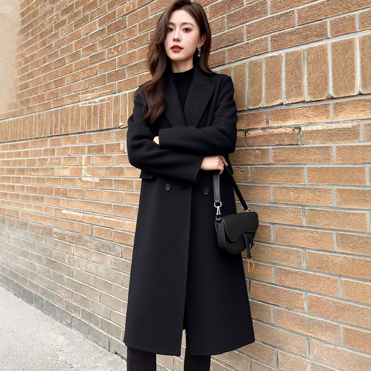伊诺大码女装气质黑色呢子大衣2025冬赫本风长款风衣外套413628