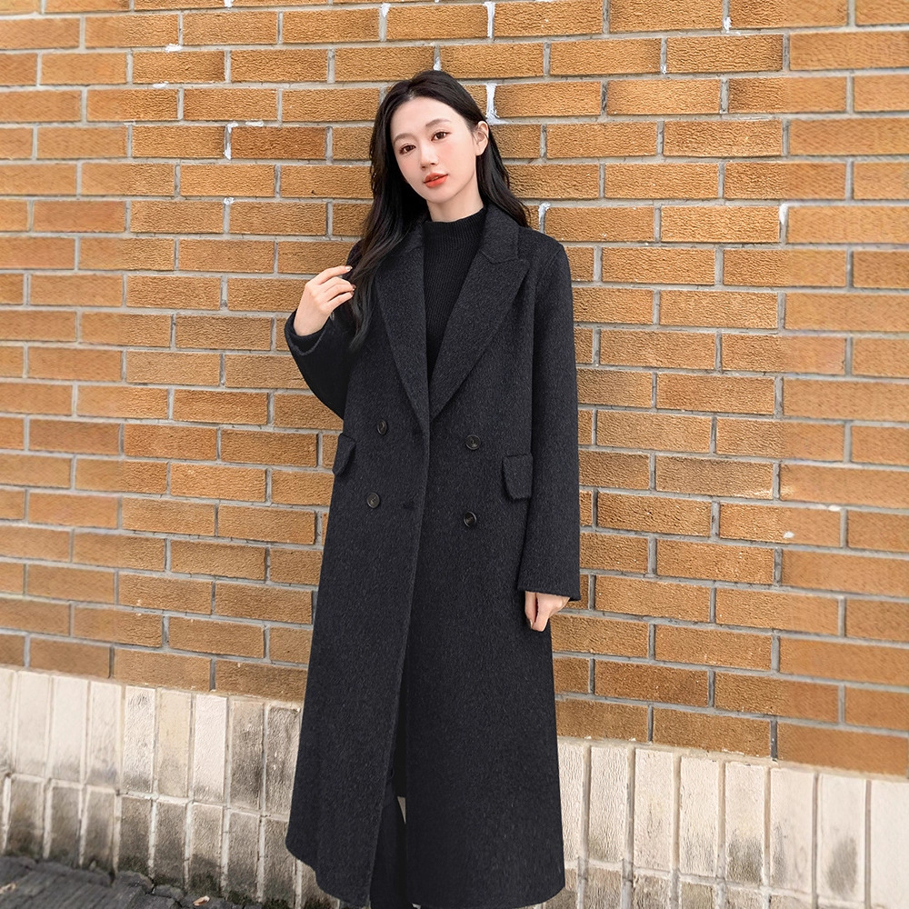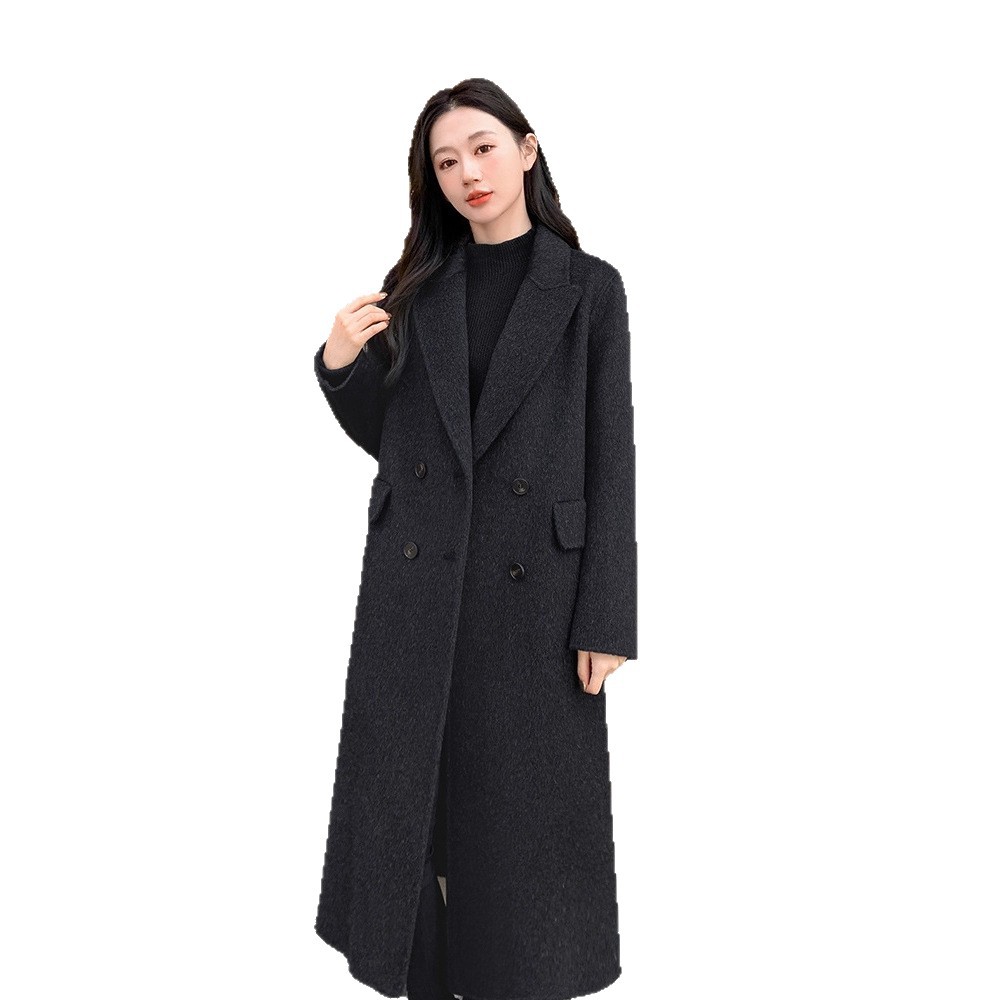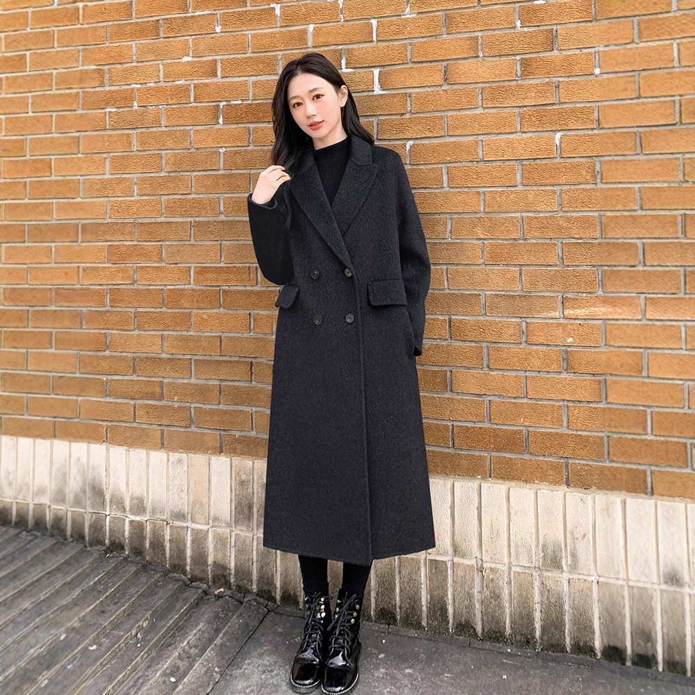 淘宝黑灰色双面呢子西装大衣秋冬新款高级感双排扣毛呢外套大码女装