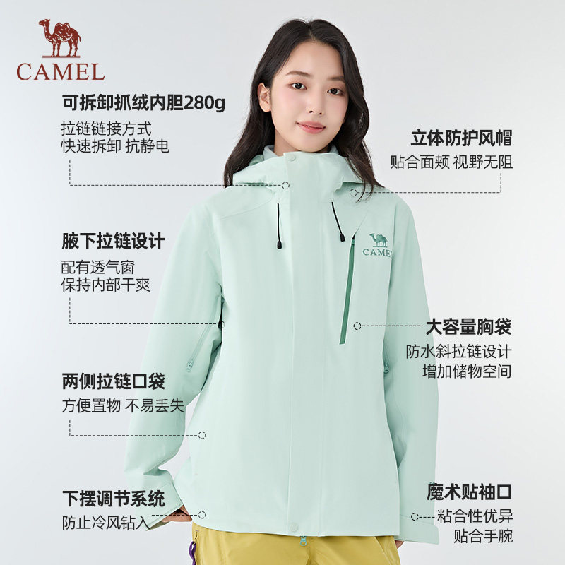 【骆驼追风者2.0】女装冲锋衣三合一春秋夹克,专为都市女性与户外爱好者打造。采用高品质防风防水面料,有效抵御风雨侵袭,透气内里保持干爽舒适。创新三合一设计,外层硬壳与内层抓绒可自由拆卸,轻松应对多变气候,春秋单穿或冬季叠加皆宜。立体剪裁贴合女性身形,兼顾时尚与功能性,多口袋设计提升实用度。轻盈便携,折叠后不占空间,是通勤、旅行、徒步的理想伴侣。骆驼追风者2.0,以专业科技诠释户外美学,让每一步都自在追风。