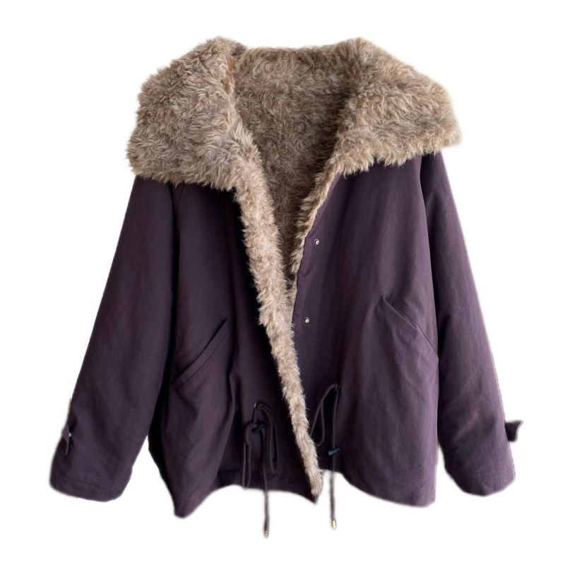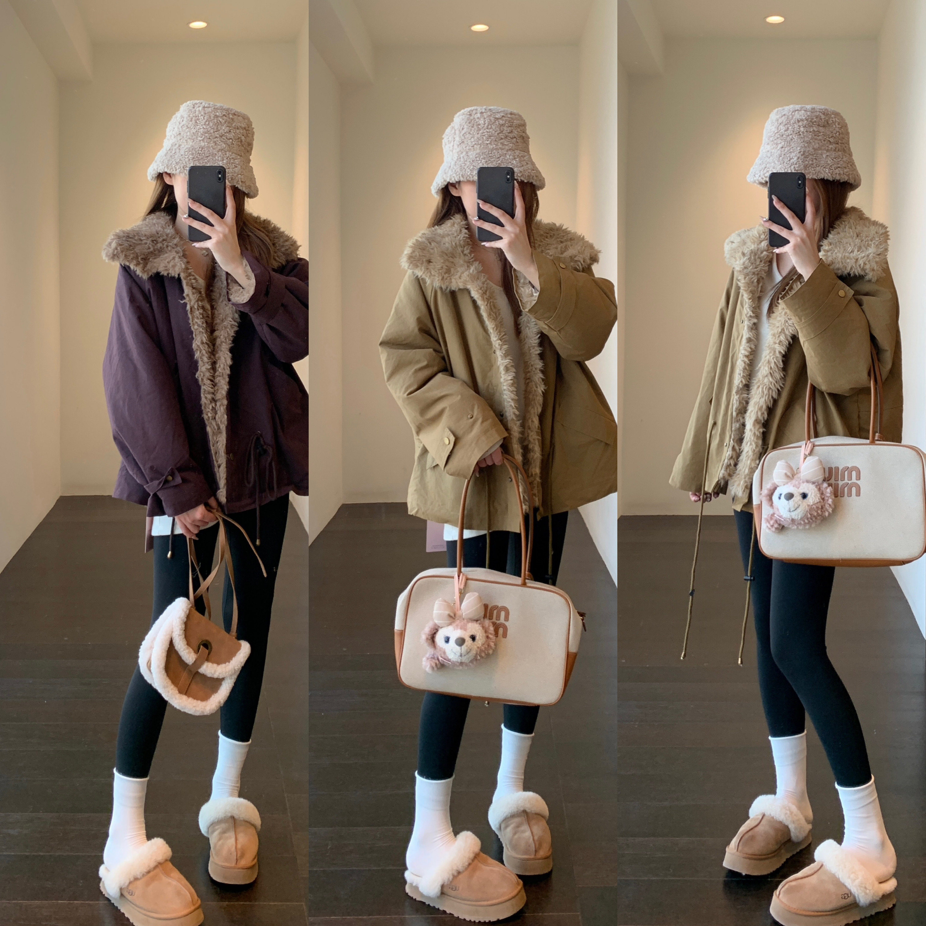 ByYou 冬季老钱风羊毛领麂皮绒环保皮草外套女卡其色加绒加厚大衣
