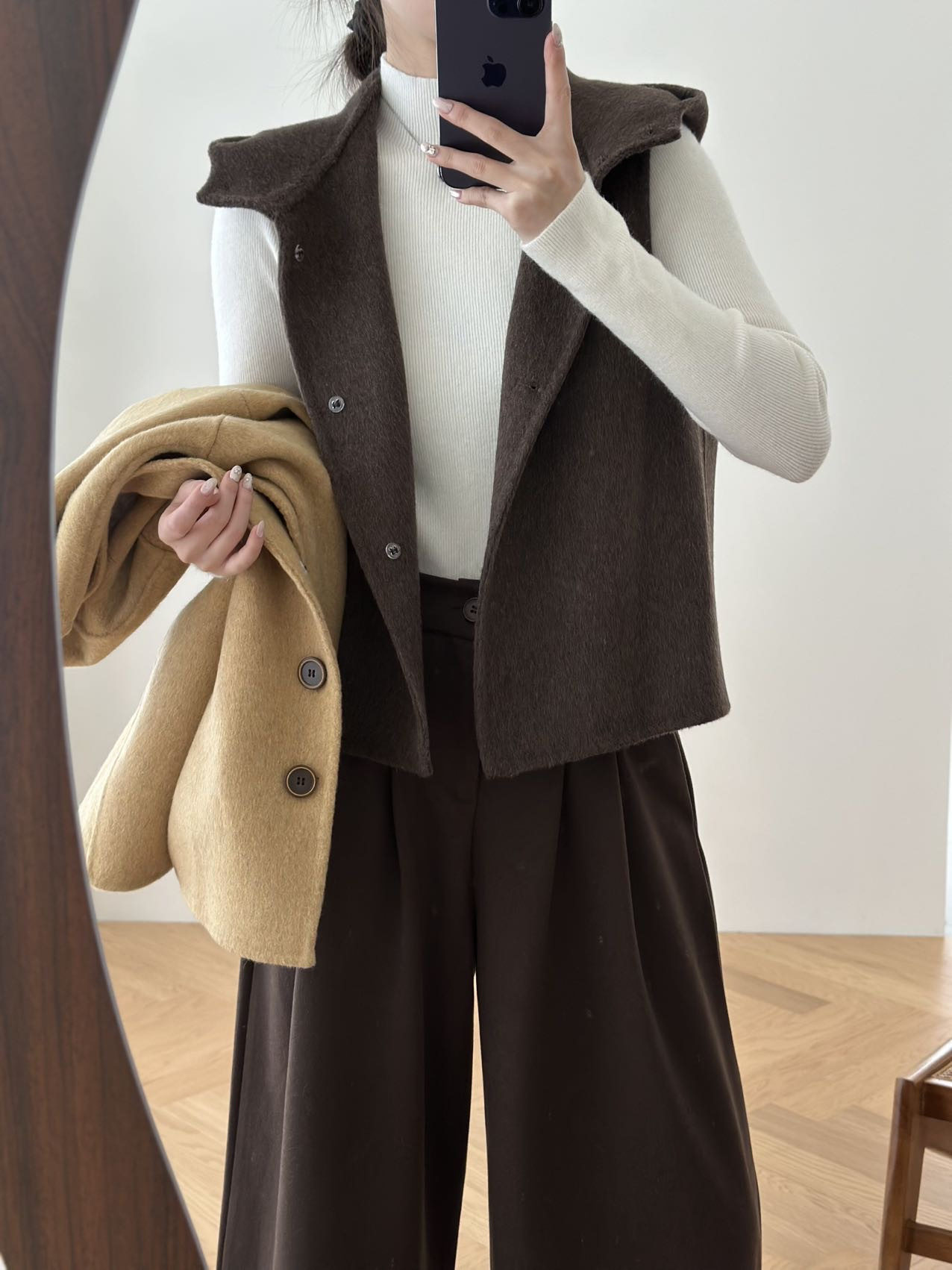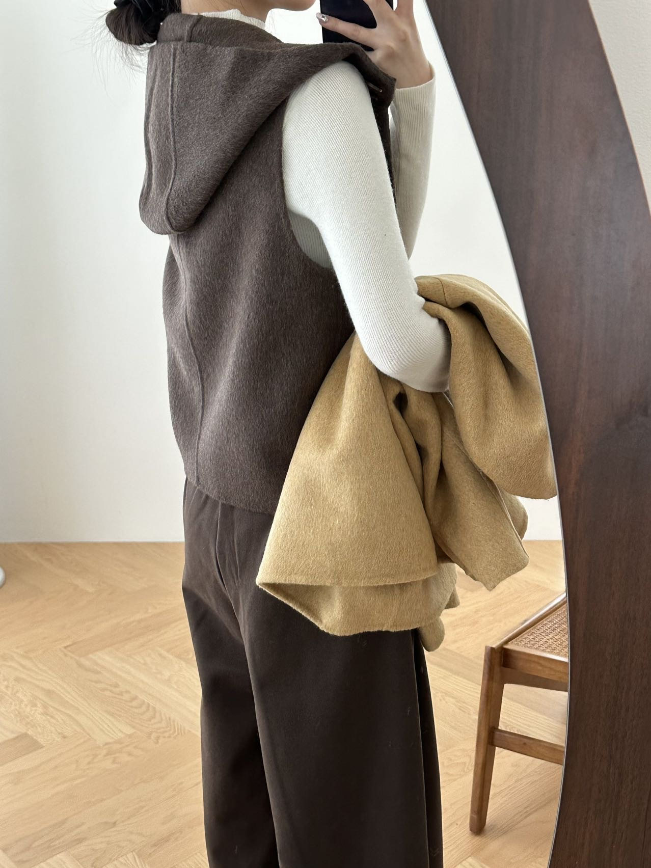 淘宝韩系V领阔形双面羊毛呢大衣女冬撞色连帽毛呢外套马甲两件套9496