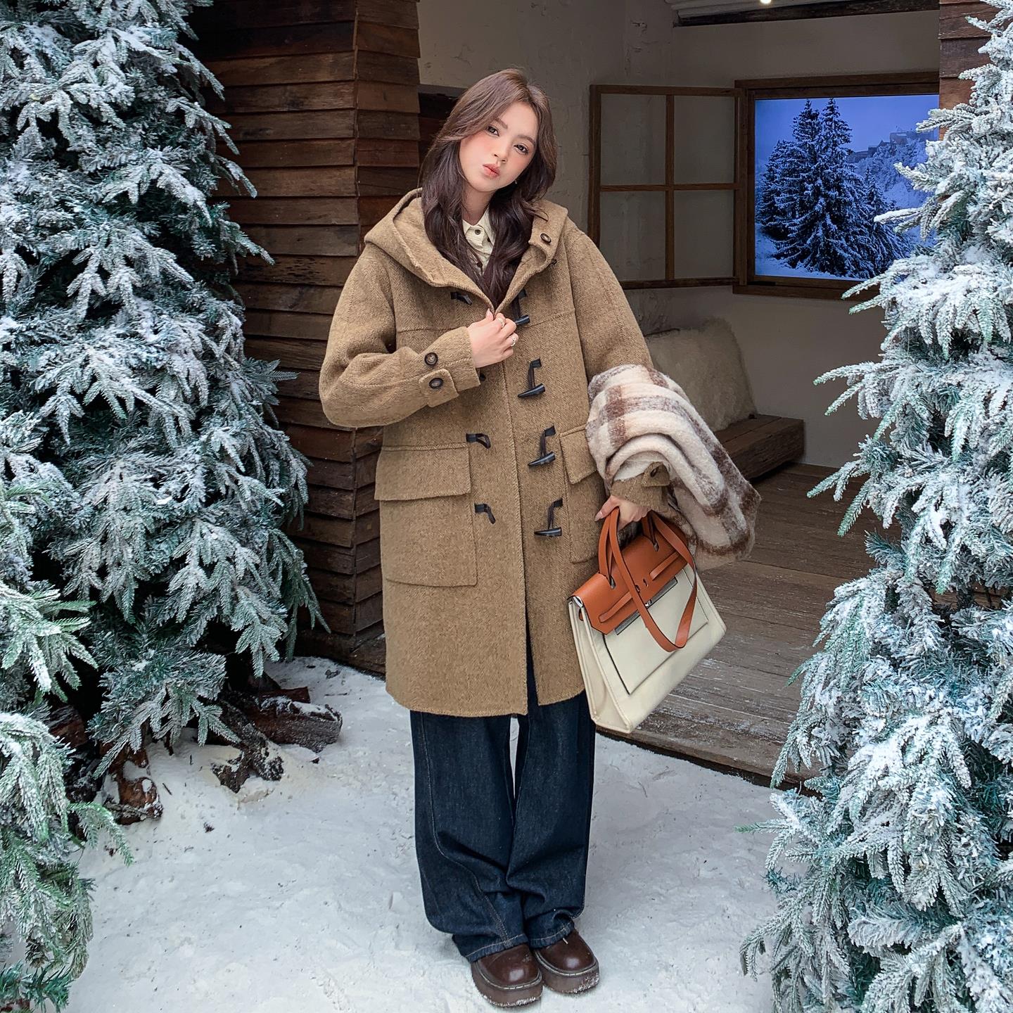 Rou8ao微胖大码女装牛角扣设计外套女冬季宽松加厚毛绒绒棉服大衣