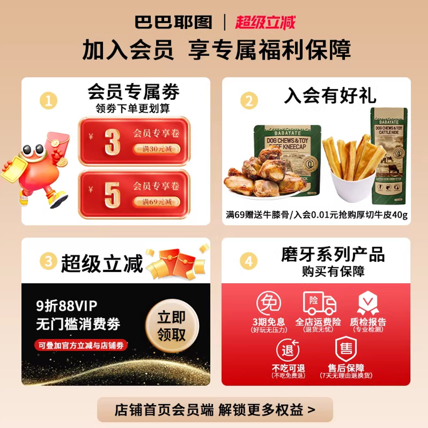 巴巴耶图牛膝盖骨狗狗磨牙棒,专为小、中、大型犬设计,采用天然牛膝盖骨精制而成,质地坚硬耐咬,有效帮助狗狗磨牙洁齿,减少牙垢和口臭。产品无添加人工色素与防腐剂,安全健康,满足狗狗咀嚼天性,缓解换牙期不适与分离焦虑。同时兼具零食与玩具功能,在互动中增进人宠感情。适用于各阶段犬只,是日常护理与奖励的理想选择。坚持使用,有助于维护口腔健康,让爱犬拥有更强健的牙齿和更清新的口气。巴巴耶图,专注宠物健康,陪伴每一刻快乐时光。