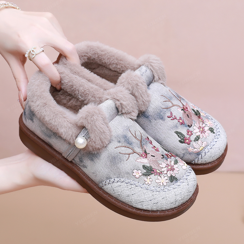 天猫意迪森刺绣老北京棉鞋冬季保暖舒适刺绣一脚蹬妈妈中老年防滑布鞋