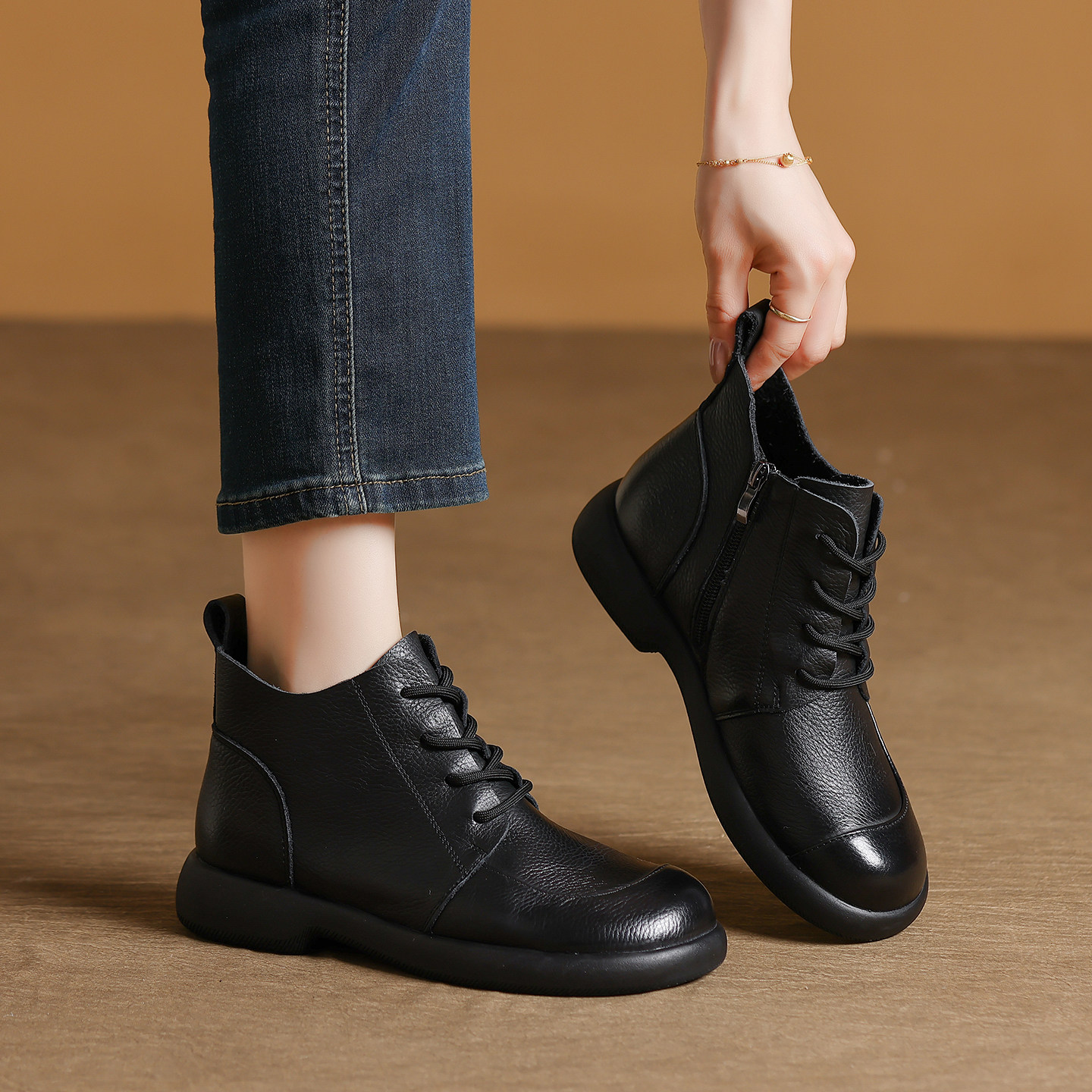 这款头层牛皮复古手工短靴,专为秋冬打造,融合经典马丁靴设计与实用保暖功能。精选优质头层牛皮,质感细腻,耐用透气,经手工打磨呈现自然复古光泽。内里加绒设计,温暖舒适,适合寒冷季节穿着。系带平底款式,穿脱便捷,贴合脚型,久走不累。防滑橡胶大底,抓地力强,雨雪天也能安心出行。简约百搭的外观,轻松搭配牛仔裤、裙装或休闲裤,适合日常通勤、出游等多种场合。无论是年轻女性还是妈妈辈,都能穿出时尚与舒适并存的秋冬风格,是兼具颜值与实穿的必备单品。