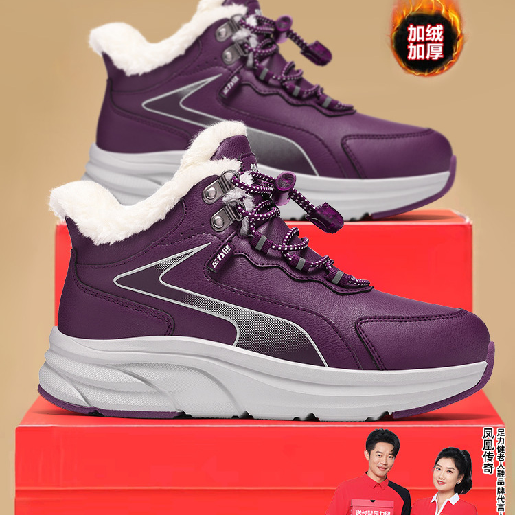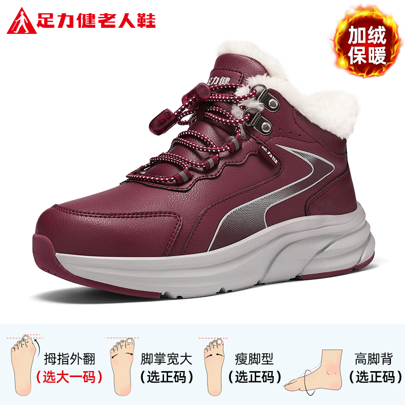 足力健官方旗舰店正品老人鞋冬季加绒保暖妈妈健步轻便皮面棉鞋女