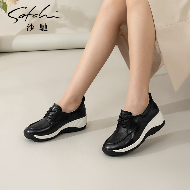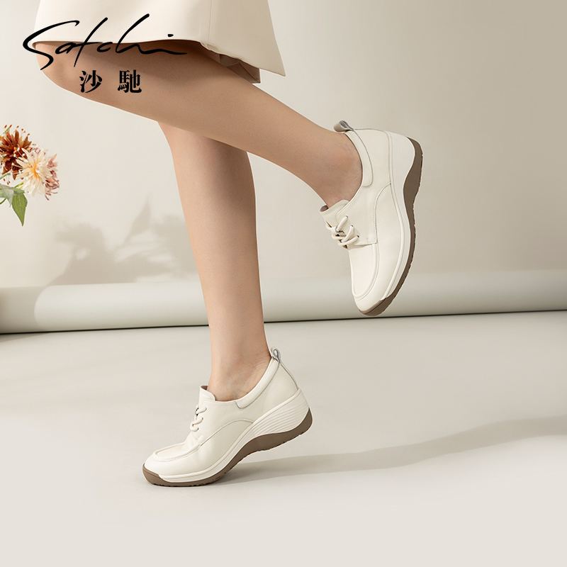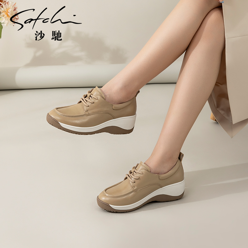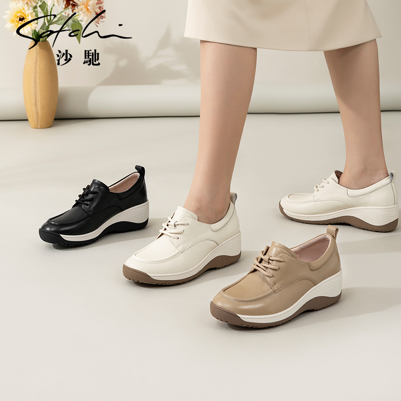 天猫沙驰女鞋轻便软底厚底乐福鞋2025秋冬季新款坡跟妈妈鞋真皮休闲鞋