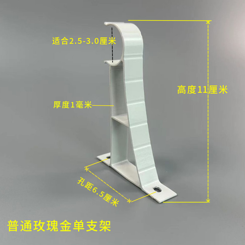 罗马杆支架侧装单孔距6.5厘米铝合金窗帘支架,是一款专为罗马杆设计的侧装固定配件,采用高强度铝合金材质,坚固耐用、防锈抗腐蚀,适用于多种家居环境。其单孔距精准设计为6.5厘米,确保与标准罗马杆完美匹配,安装稳固可靠。侧装结构节省顶部空间,特别适合吊顶较低或窗框较窄的窗户使用。配套挂钩设计便于调节窗帘高度与悬挂角度,提升使用便利性。整体外观简约大方,表面经氧化处理,质感细腻,兼具实用性与美观性,是现代家居窗帘安装的优选配件,广泛应用于客厅、卧室、书房等空间。