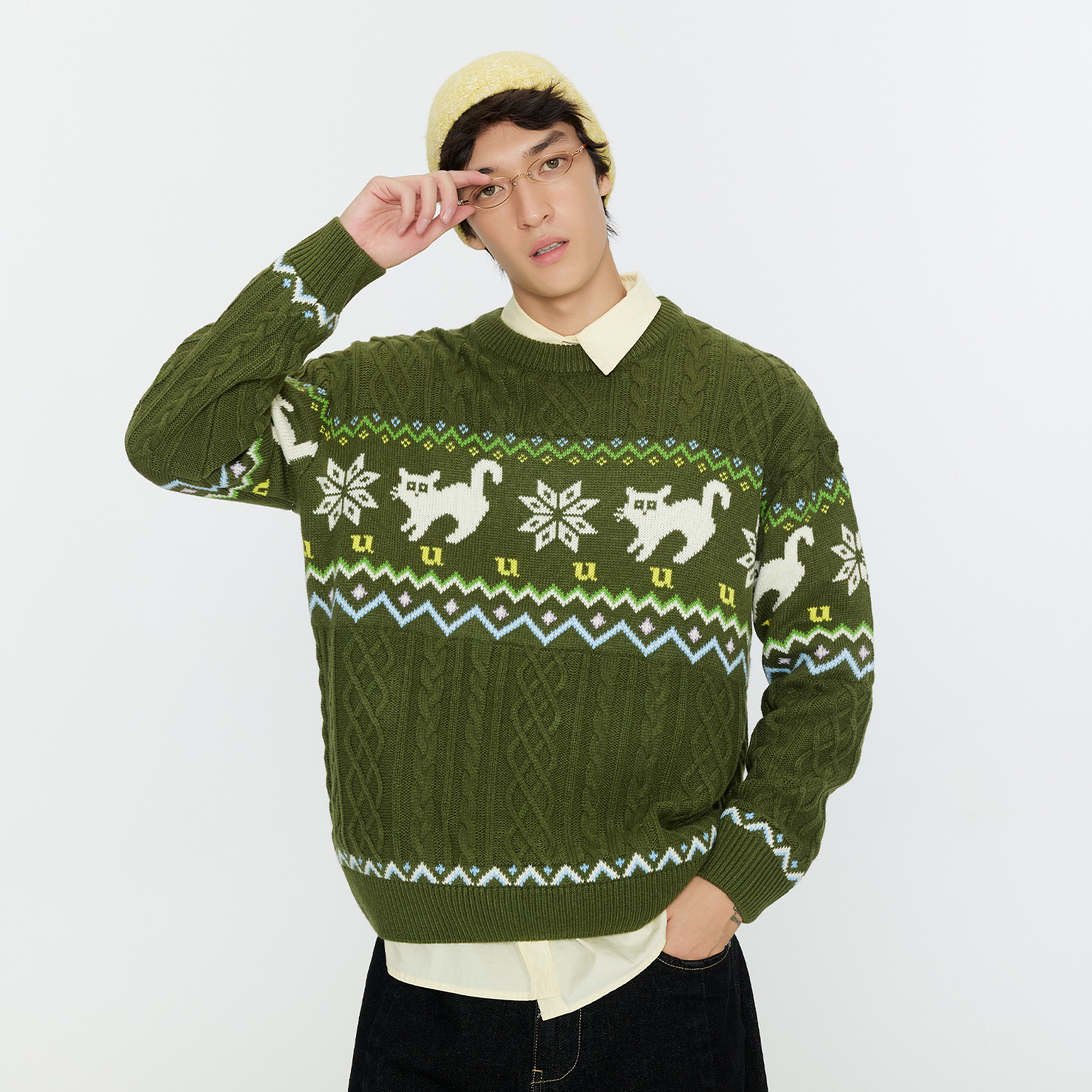 天猫GUUKA潮牌猫咪提花费尔岛毛衣男冬季加厚 麻花圆领针织衫落肩宽松