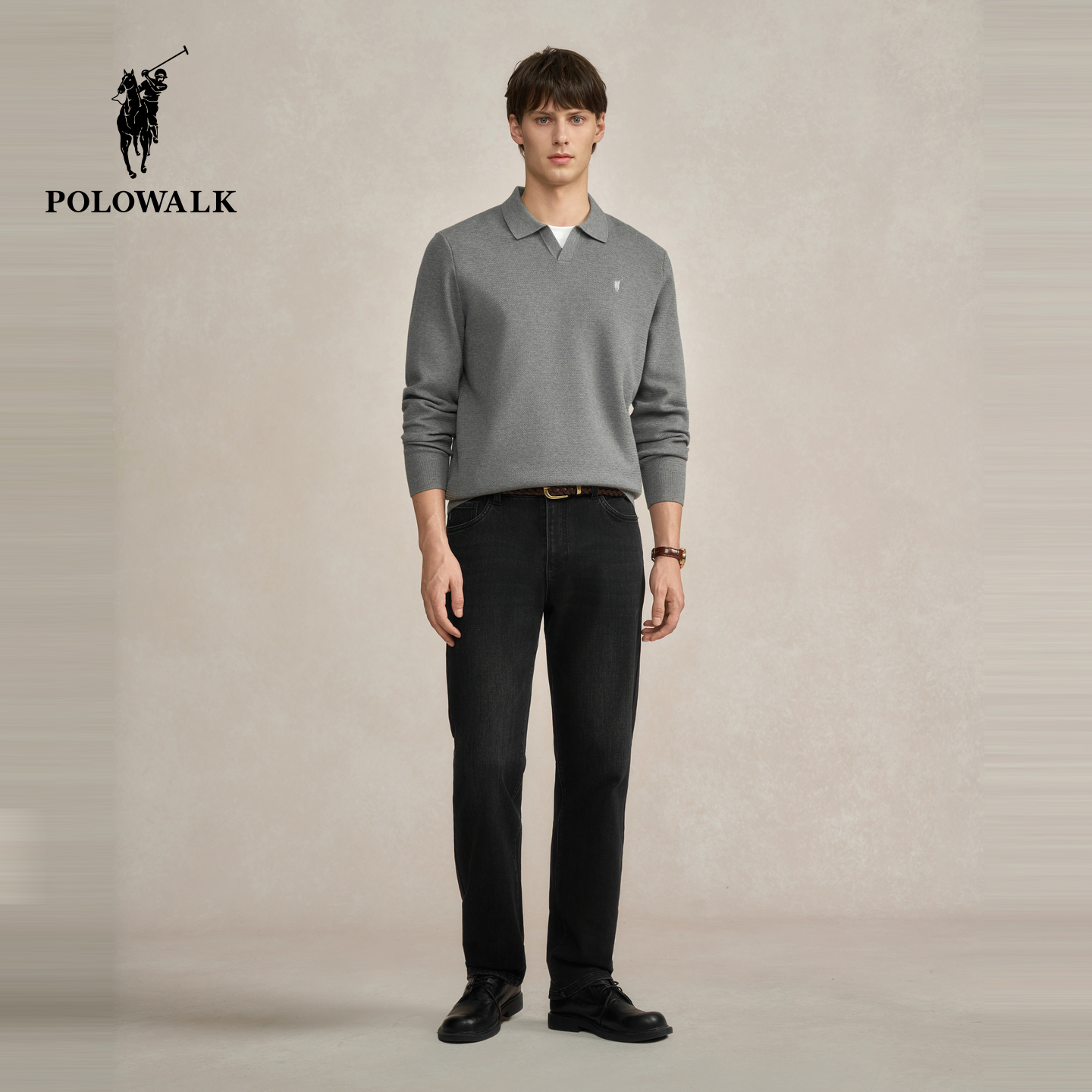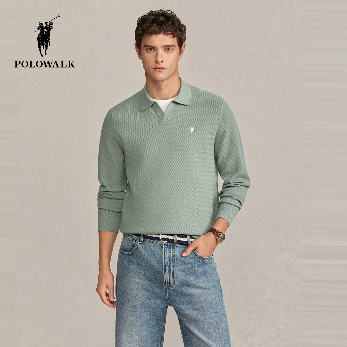 天猫POLOWALK男式针织衫2025秋季新品简约时尚假两件翻领套头上衣男