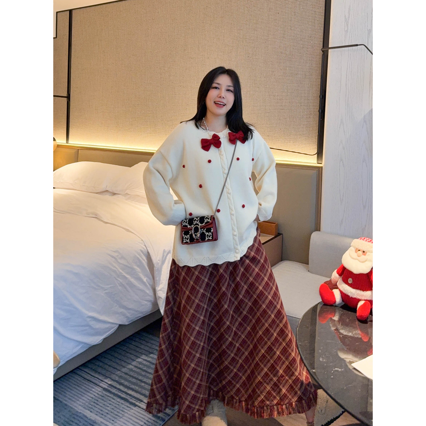 新年战袍软糯红色麻花毛衣开衫搭配格子衬衫女高腰半身裙三件套装