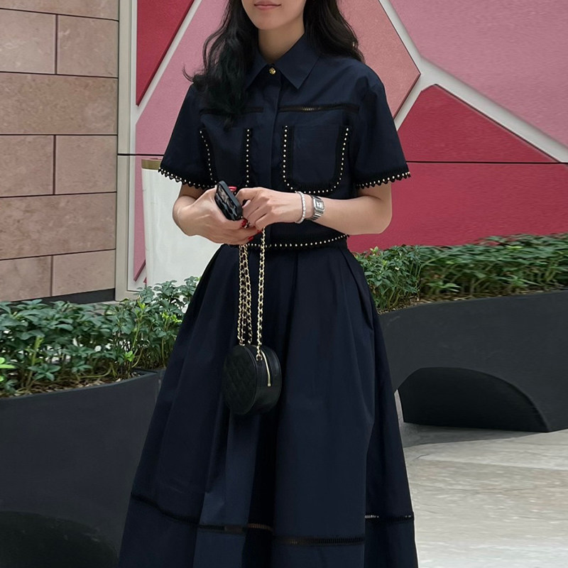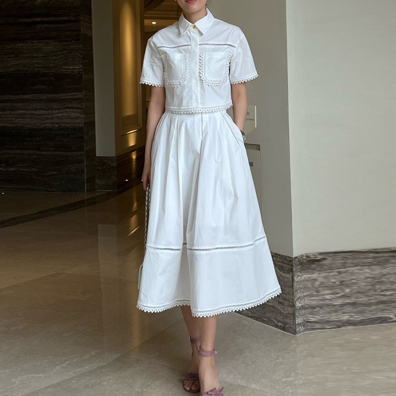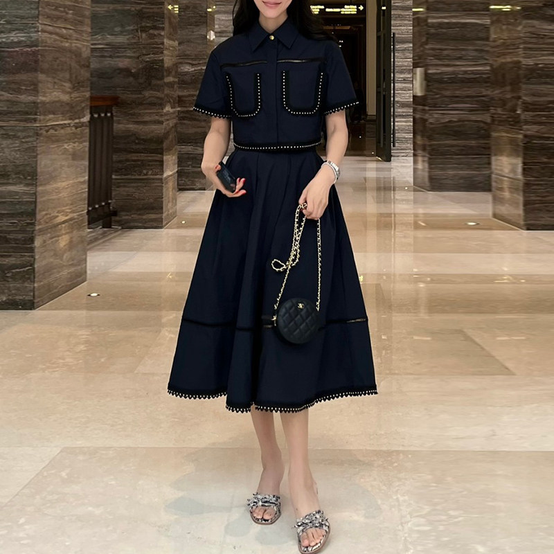 淘宝韩国chic夏季法式小众翻领钉珠花边衬衫+高腰显瘦大摆型半身裙女