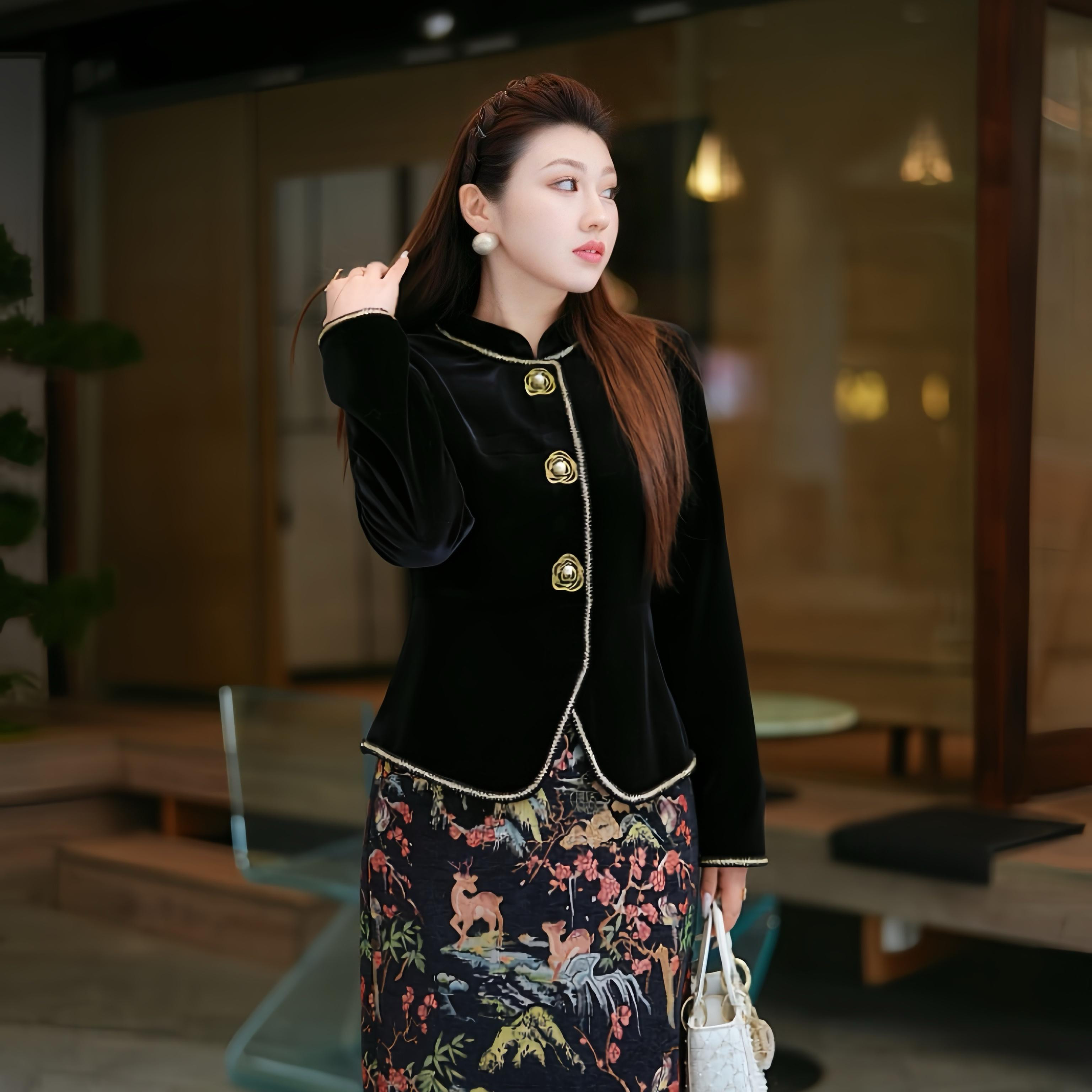 XYD71807/XYD71808秋冬中式丝绒大码女装套装,融合传统东方美学与现代时尚剪裁,专为追求优雅与舒适的女性设计。精选高品质丝绒面料,触感柔滑、垂坠感佳,保暖又显高级。提花工艺精致细腻,凸显文化底蕴,搭配显瘦A字半身裙,巧妙修饰身形,包容各种体型。大码版型宽松得体,穿着无束缚感,适合多种场合。整体设计简约大气,中式立领与盘扣细节彰显古典韵味,是秋冬季节兼具风度与温度的优选单品,轻松穿出自信与魅力。