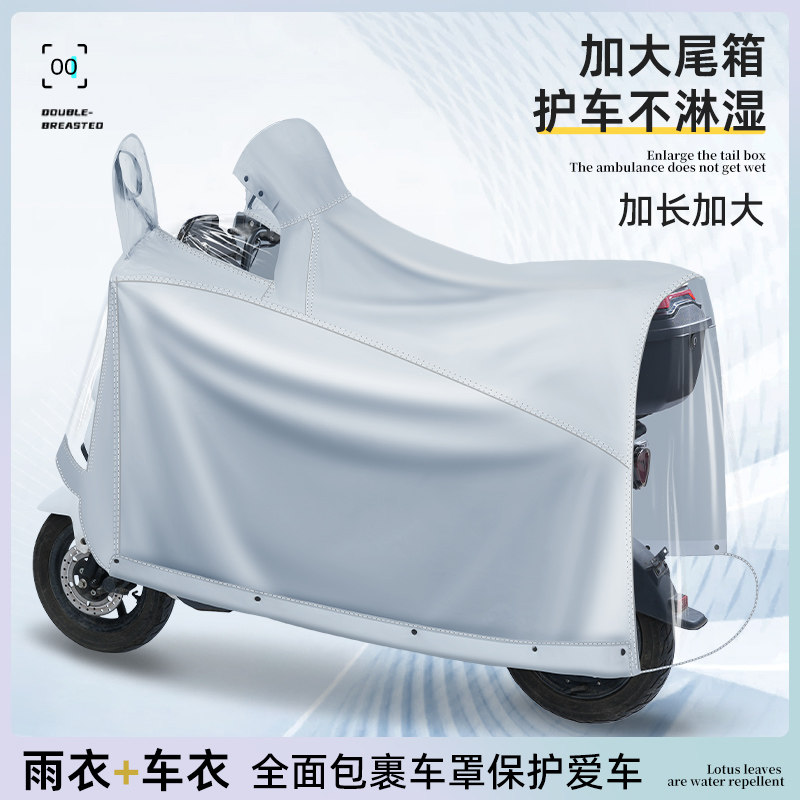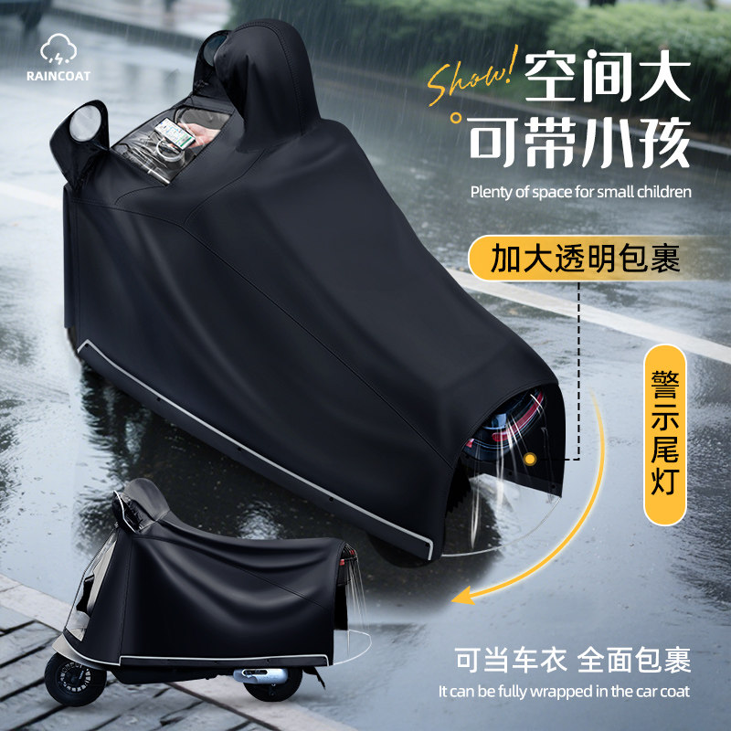 2026年新款单人雨衣电动车防暴雨加厚加大骑行雨披,专为摩托车、电瓶车骑行者设计,兼顾单人使用与双人乘坐需求。采用高密度加厚PVC涂层面料,具备超强防水、防风性能,有效抵御暴雨侵袭。加大版型设计,覆盖范围更广,保护身体及腿部不被淋湿,同时预留双人空间,方便后座乘客共用。立体帽檐与可调节帽口设计,确保视线清晰;反光条加持,提升夜间骑行安全。背部透气孔设计,减少闷热感,穿着更舒适。轻便易折叠,收纳便捷,是雨天出行的理想防护装备。