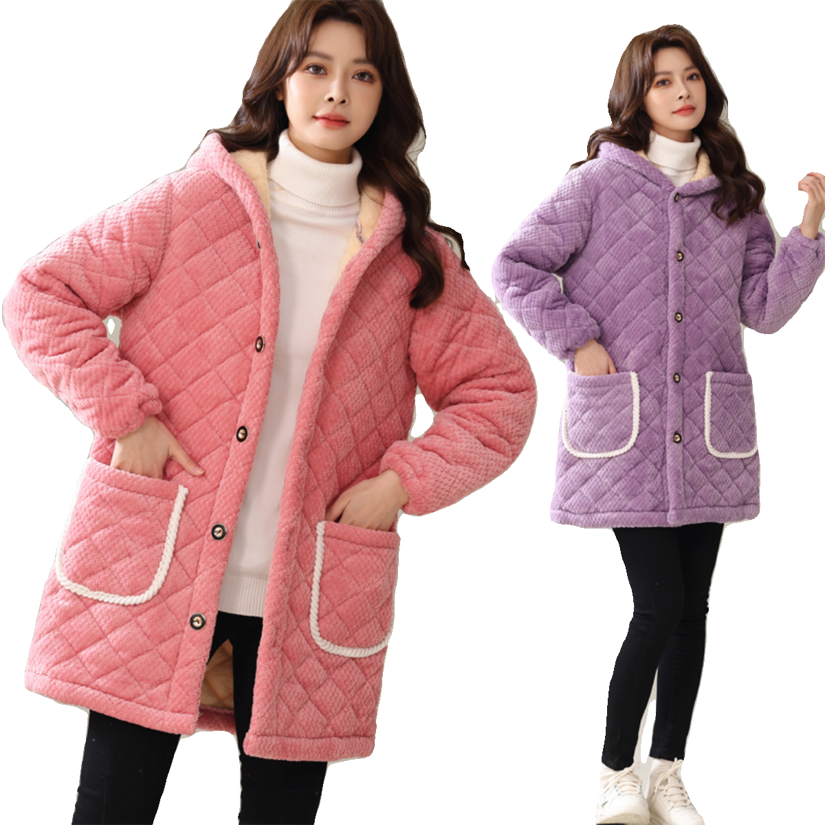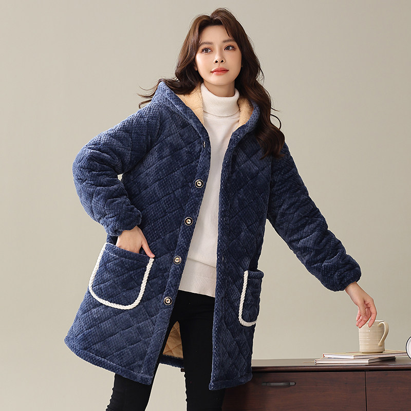 淘宝冬季新款法兰绒加绒加厚女装家居服三层夹棉保暖罩衣防寒棉衣外套