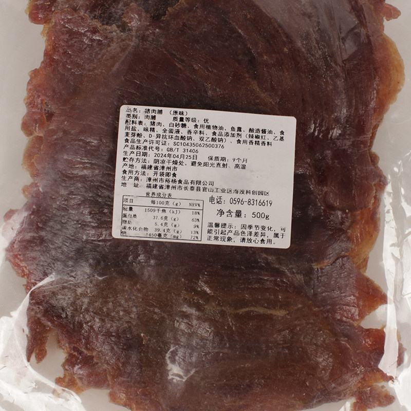 裕杨食品闽南大猪肉脯,精选优质猪后腿肉,传承闽南古法工艺,经秘制酱料腌制、慢火烘烤而成。500g大包装,片片厚实,色泽红亮,口感紧实有嚼劲,肉香浓郁,咸甜适中,越嚼越香。无添加防腐剂,即开即食,是追剧、办公、出游的理想休闲零食。作为网红爆款小吃,深受年轻人喜爱,无论是自享还是送礼都倍有面儿。裕杨食品坚持品质为本,严控每一道工序,确保食品安全与美味并存。闽南风味,地道好味,一口就上瘾!