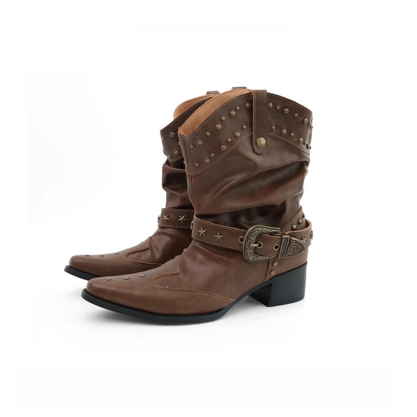2025新款棕色牛皮褶皱短靴,融合复古西部风情与现代时尚设计,采用优质头层牛皮打造,质感细腻,耐用透气。鞋面自然褶皱纹理搭配个性铆钉装饰,彰显不羁格调,尖头设计延伸腿部线条,视觉显瘦显高。粗跟稳健舒适,兼顾日常通勤与出街凹造型,轻松驾驭裙装、牛仔裤等多种穿搭风格。棕色经典百搭,四季皆宜,是追求个性与实用并重的女性衣橱必备单品。无论是都市漫步还是周末聚会,这款短靴都能为你增添一抹复古摩登气息,演绎自信从容的时尚态度。