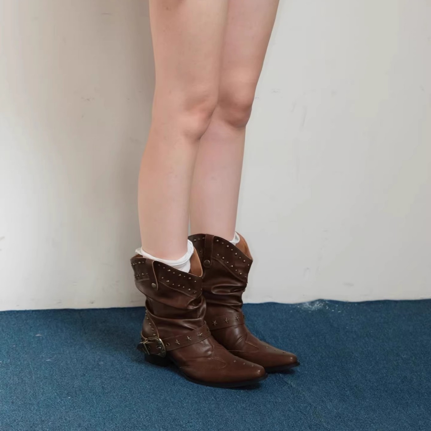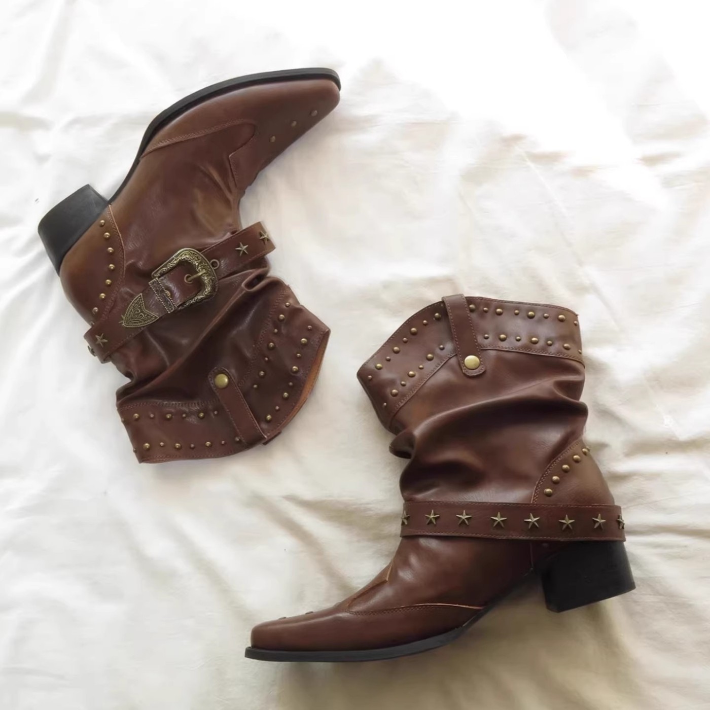 淘宝2025新款棕色牛皮褶皱短靴女复古铆钉粗跟显瘦百搭尖头西部时装靴