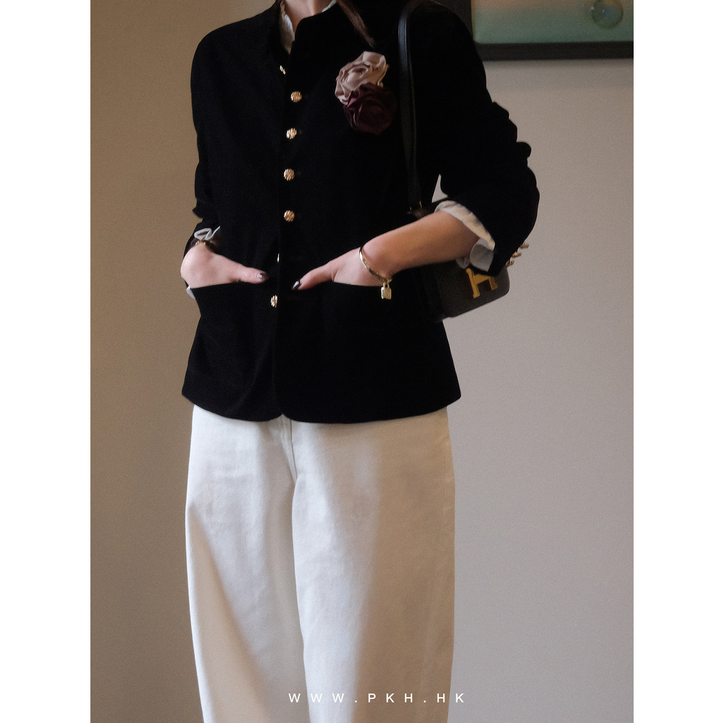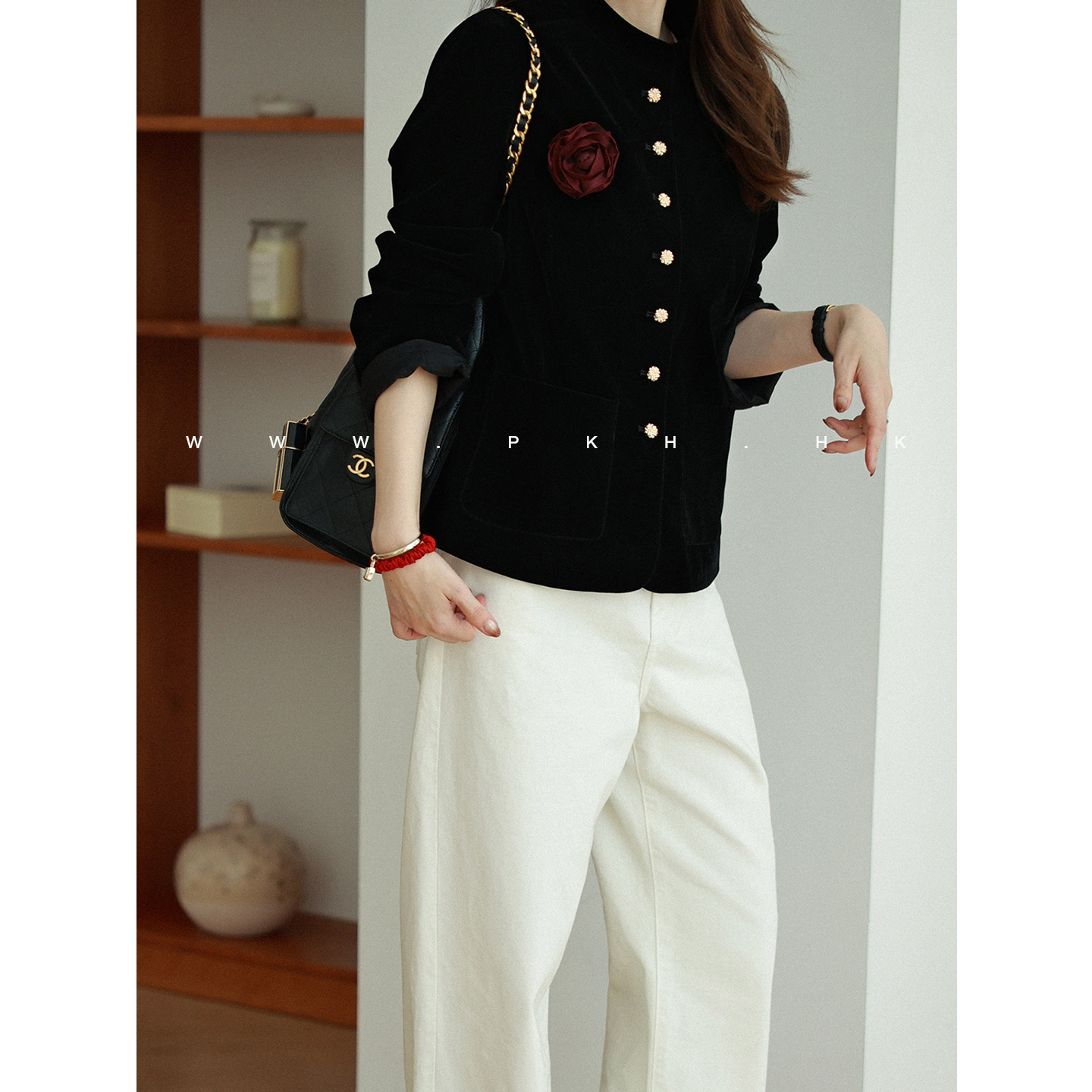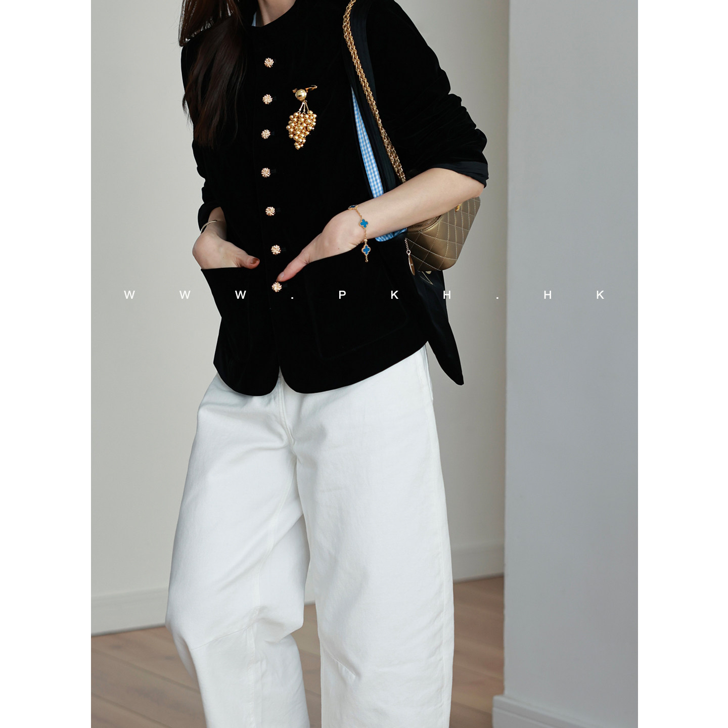 PKH.HK特春上新推出自留有品系列,这款时髦精致的黑色丝绒西装外套,以高级质感诠释现代都市美学。精选细腻丝绒面料,触感柔滑,光泽内敛,尽显低调奢华。利落剪裁搭配微收腰设计,凸显身形线条,干练而不失优雅。点睛之笔在于前襟与袖口处点缀的精致小金扣,金属光泽与丝绒形成巧妙对比,增添一抹轻奢亮点。无论是通勤搭配西裤,还是混搭裙装,都能轻松驾驭多种场合。PKH.HK以匠心工艺融合时尚设计,为追求品质与风格的你,带来春日里的优雅新选择。