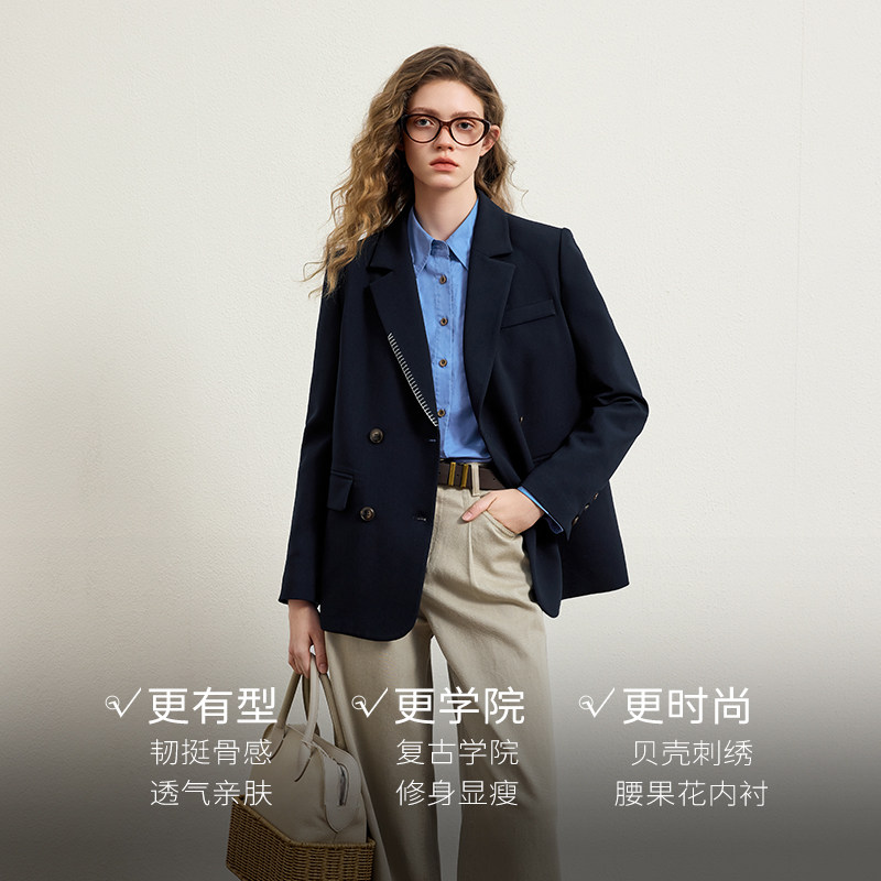 KBNE 2026春季新款藏青色休闲西装外套,专为小个子女性打造,融合时尚与实穿性。采用挺括有型的面料,剪裁利落修身,巧妙拉长身形比例,轻松穿出高挑气质。经典藏青色百搭耐看,适合通勤、约会或日常穿搭。长袖设计兼顾春日的微凉,翻驳领与单排扣点缀简约细节,彰显优雅干练。内里走线工整,口袋实用美观,整体版型不挑身材,凸显女性知性魅力。无论是搭配裙装还是裤装,都能轻松驾驭多种风格,是春季衣橱不可或缺的时尚单品。