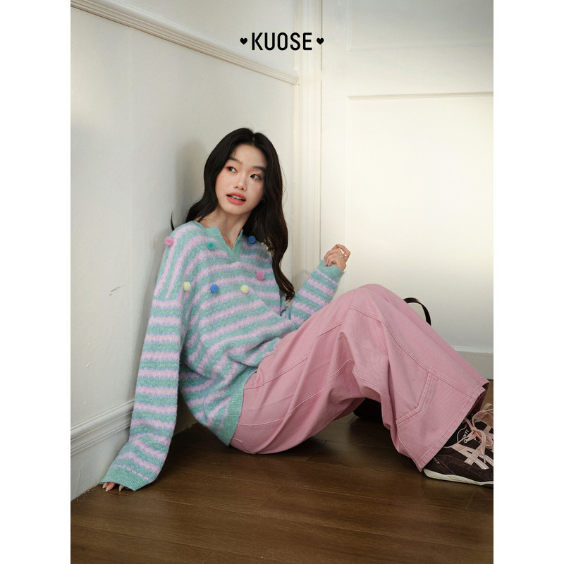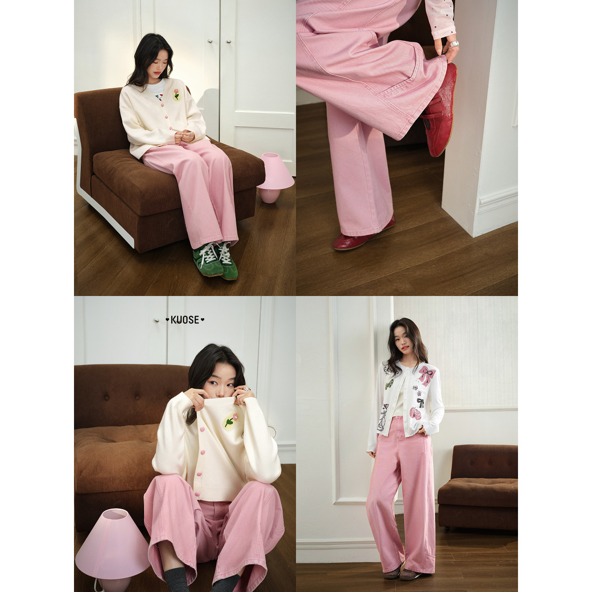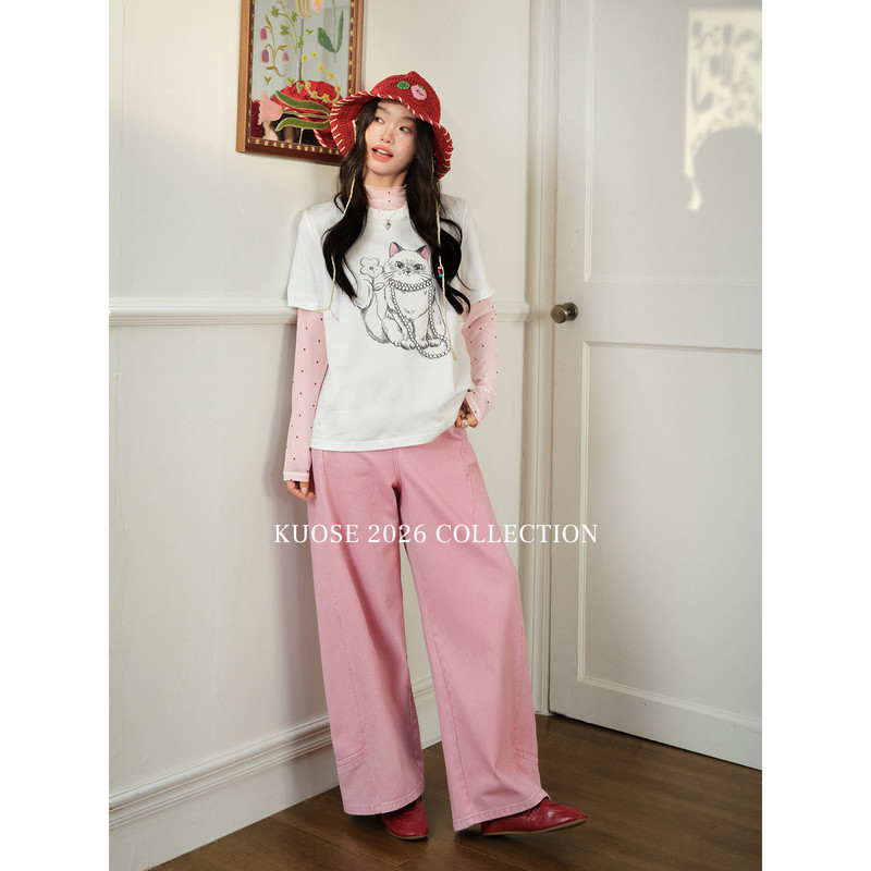 天猫阔色美式粉色弯刀阔腿牛仔裤女装2026春季新款直筒休闲长裤子秋冬