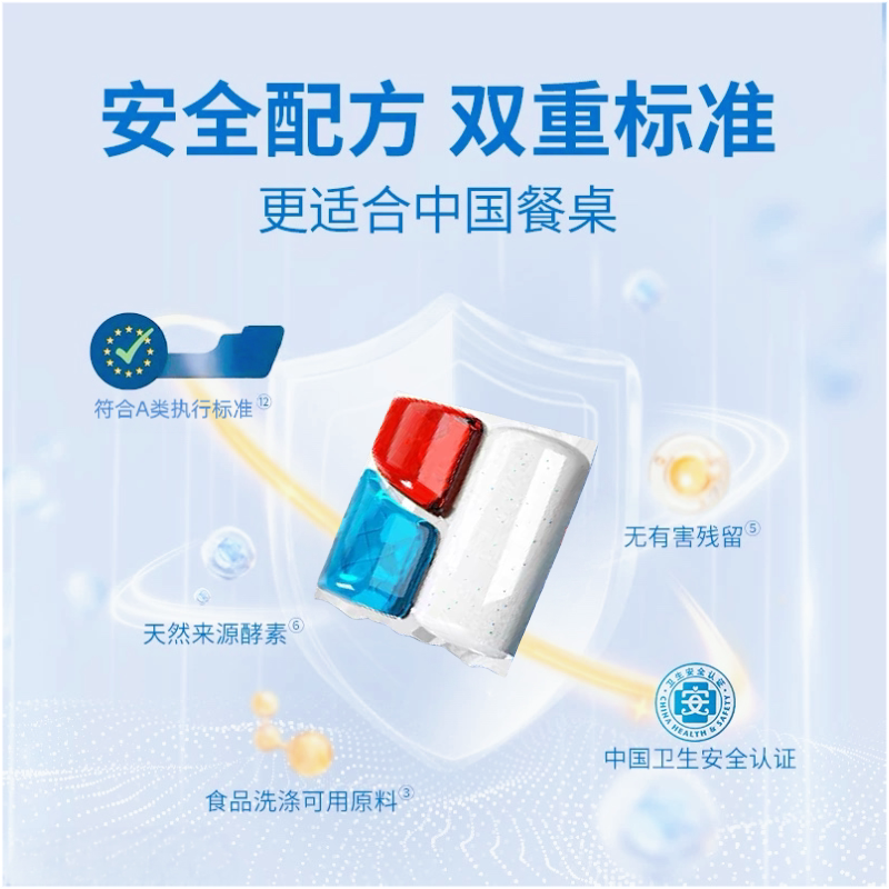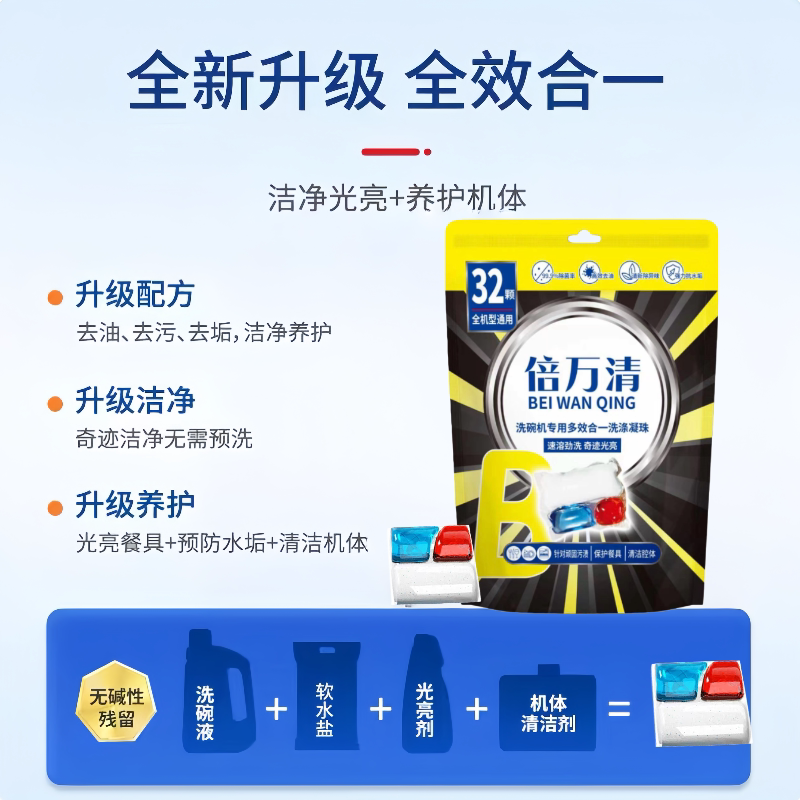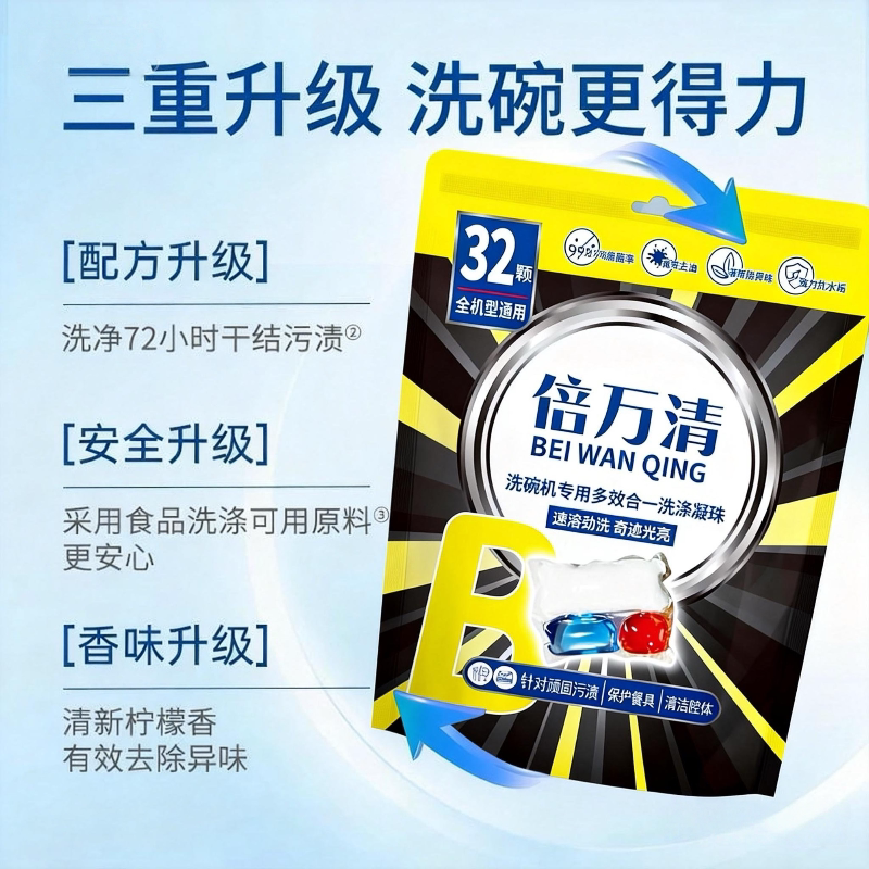 洗碗机专用洗碗凝珠洗涤剂三合一,集清洁、漂洗、软水三大功能于一体,高效去油除菌,轻松应对各种顽固污渍。其强效活性成分能深入分解食物残渣,确保餐具洁净如新,同时保护洗碗机内部组件,延长使用寿命。适用于所有品牌洗碗机,兼容标准与紧凑型机型,使用便捷,一颗即可满足全程洗涤需求。凝珠包装采用水溶性膜,遇水即溶,无残留,环保安全。低泡配方不伤机器,呵护餐具釉面,让玻璃透亮、瓷器光洁。无论是日常用餐还是聚会后的大量餐具,都能轻松应对,是现代厨房的理想清洁伴侣,省时省力,洁净无忧。